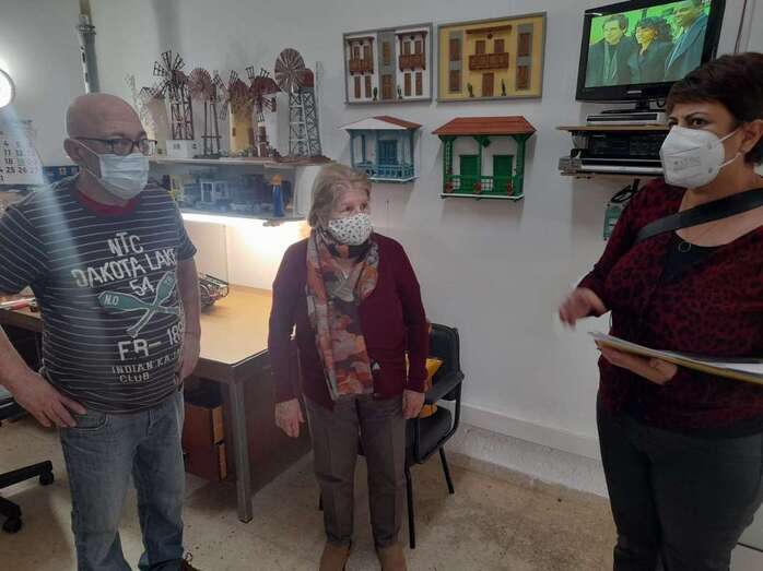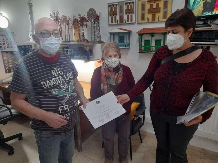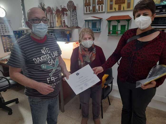 Durante la visita de este lunes a Entre Amigos, la consejera Alonso entregó un diploma de reconocimiento a Roque Hernández Casiano, destacado miembro de este colectivo jinamero, por su labor artesanal al frente de un taller de manualidades.