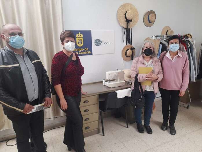 Este pasado lunes, la sede de la asociación que lidera Jesús (Suso) Santana en el Centro Cívico de Jinámar (antes Gerencia del Valle de Jinámar), la consejera de Industria, Comercio y Artesanía de la Corporación grancanaria, la teldense Minerva Alonso, que ya está al tanto del proyecto, acudió de nuevo al local de Entre Amigos con el equipo de la Fundación para la Etnografía y el Desarrollo de la Artesanía Canaria (Fedac), integrado por su directora gerente, Águeda Hernández; directora de investigación, Caridad Rodríguez, y el técnico Francisco Mireles Betancor, para conocer de primera mano con esta ambiciosa iniciativa etnográfica, en la que trabajan ya 10 asociadas utilizando como guía para confeccionar de los trabajo la obra La vestimenta tradicional de Gran Canaria, publicación del etnógrafo e historiador José Antonio Pérez Cruz, conocido por Teno.