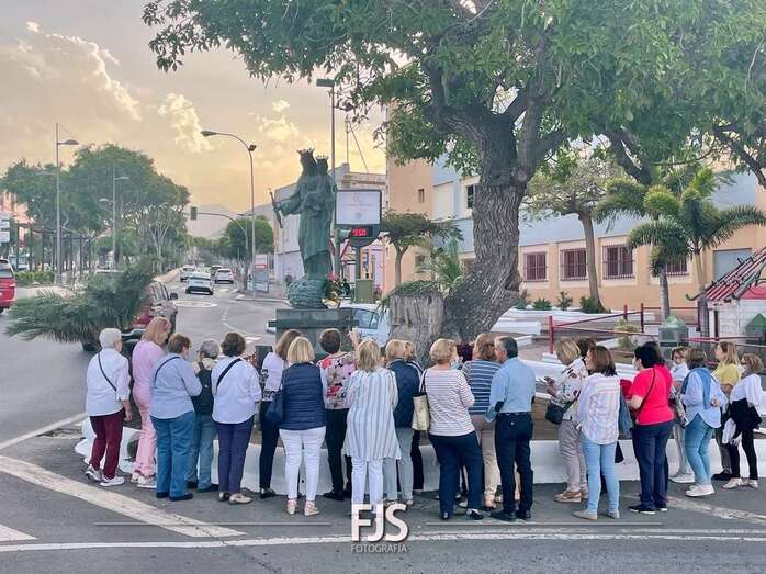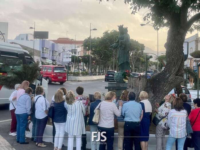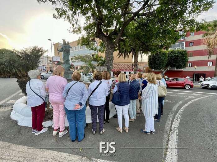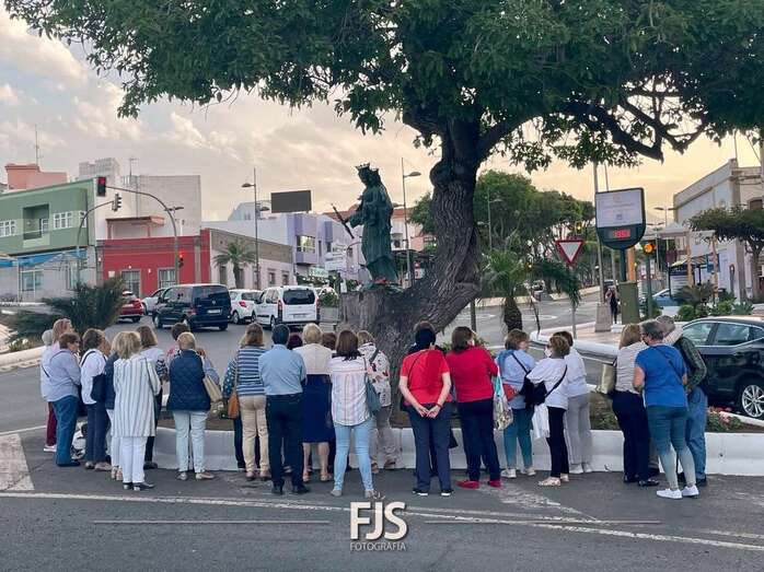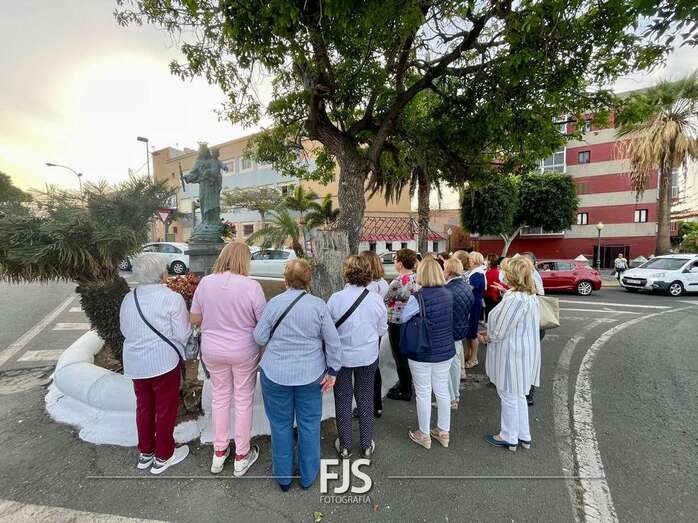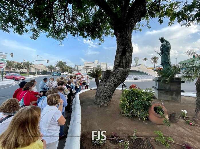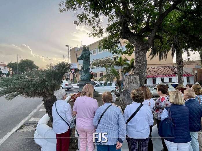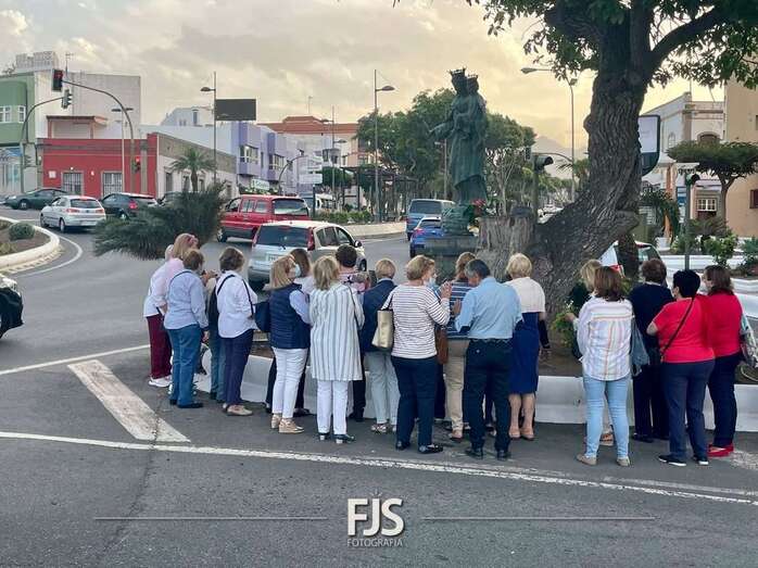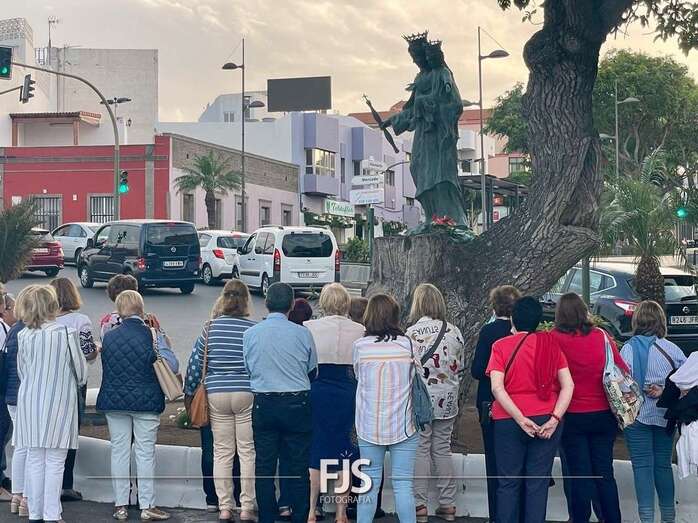 Las antigua alumnas del colegio salesiano María Auxiliadora de Telde rindieron pleitesía este martes por la tarde a la escultura de la Virgen colocada en la entrada a la ciudad sobre una peana próxima a la rotonda de Daora.