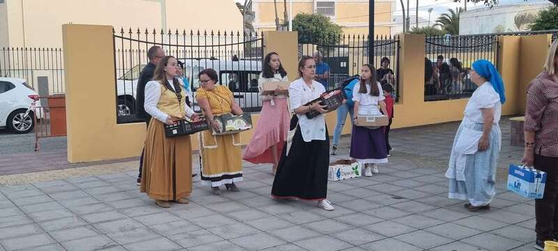 La ofrenda ante el trono del santo  en la plaza pública formaba parte del programa festivo en su honor organizado por el colectivo vecinal Las Mansas.
