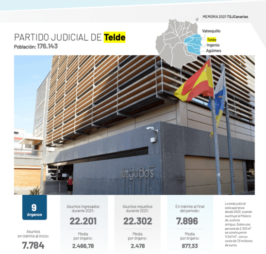 Sobre la evolución del 2020 al 2021, el TSJC indica que el partido judicial de Telde experimentó un 16,8 % más de asuntos en trámite, un + 18,3 % en asuntos ingresados, un + 31,4 en asuntos resueltos y + 1,4 en trámite al final del periodo.