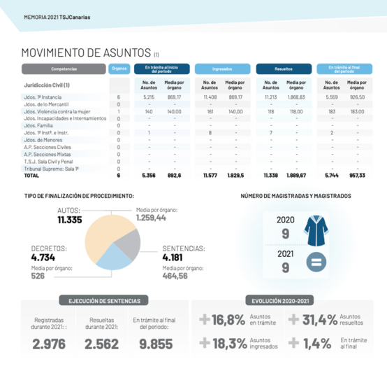 En cuanto a la ejecución de sentencias, de los datos del informe se desprende que el partido judicial de Telde registró 2.976 durante 2021, 2.562 sentencias resueltas y 9.855 en trámite al final del periodo.