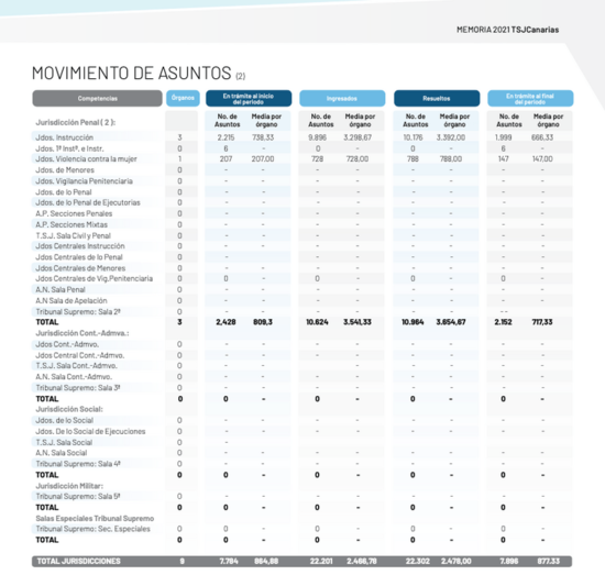 Durante 2021 ingresó 22.201 asuntos, con una media por órgano de 2.466,78. Y resolvió 22.302, con una media por órgano de 2.478, para finalizar el año con 7.896 asuntos en trámite, lo que arroja una media de 877,33 por órgano.