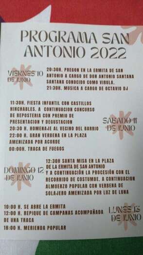 El domingo, a las 12.30 horas, una misa en la plaza de la ermita de San Antonio y, a continuación, procesión con el santo por el recorrido de costumbre para finalizar el día con un almuerzo popular y una verbena del solajero amenizada por Luz de Luna.