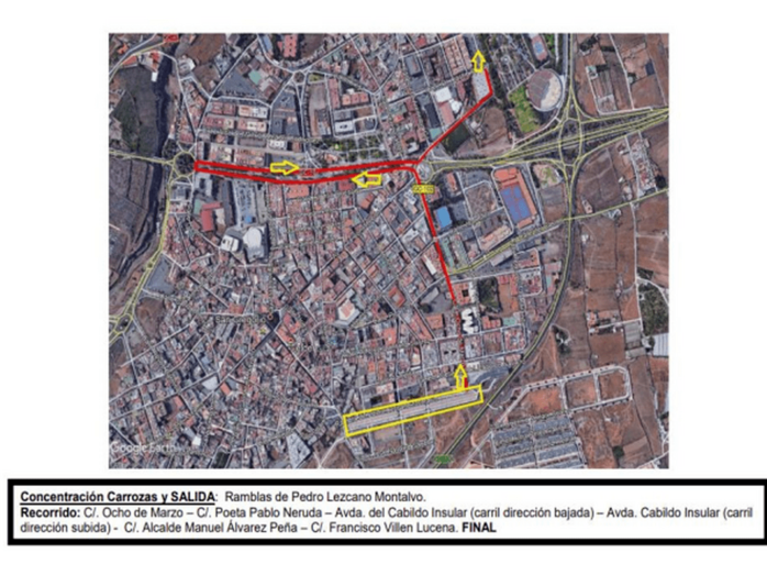 El recorrido partirá a las 17.30 horas desde la Ramblas de Pedro Lezcano Montalvo y continuará por las calles Ocho de Marzo, Poeta Pablo Neruda, Avenida del Cabildo, tanto de bajada como de subida, para desviarse posteriormente por Alcalde Manuel Álvarez Peña y culminar en Francisco Villén Lucena, junto al parque de San Juan. Al concluir la Cabalgata, el auditorio José Vélez será el escenario de un mogollón con Leyenda Joven.