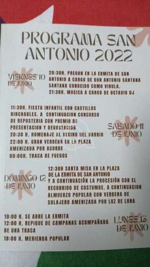 El domingo, a las 12.30 horas, una misa en la plaza de la ermita de San Antonio y, a continuación, procesión con el santo por el recorrido de costumbre para finalizar el día con un almuerzo popular y una verbena del solajero amenizada por Luz de Luna.