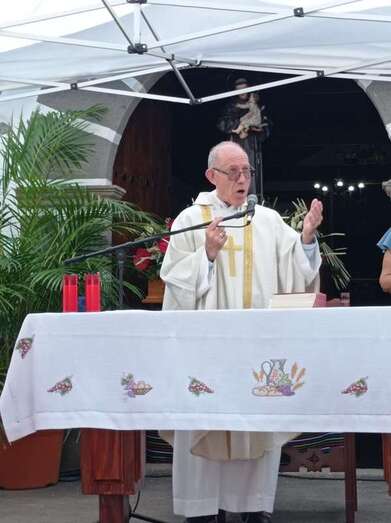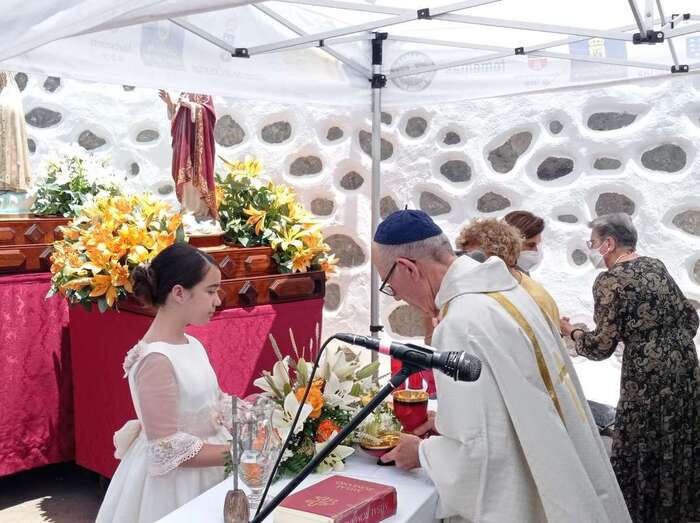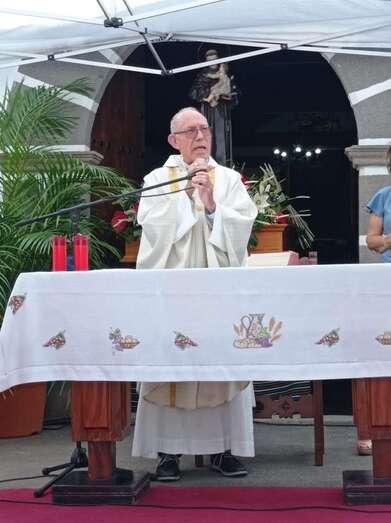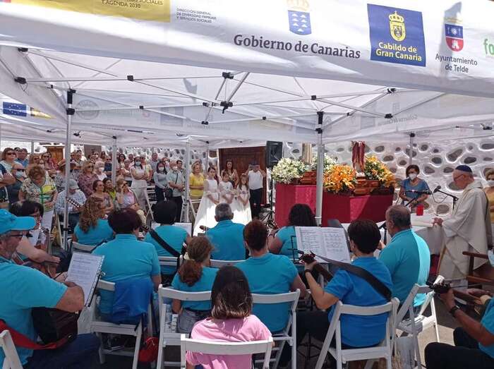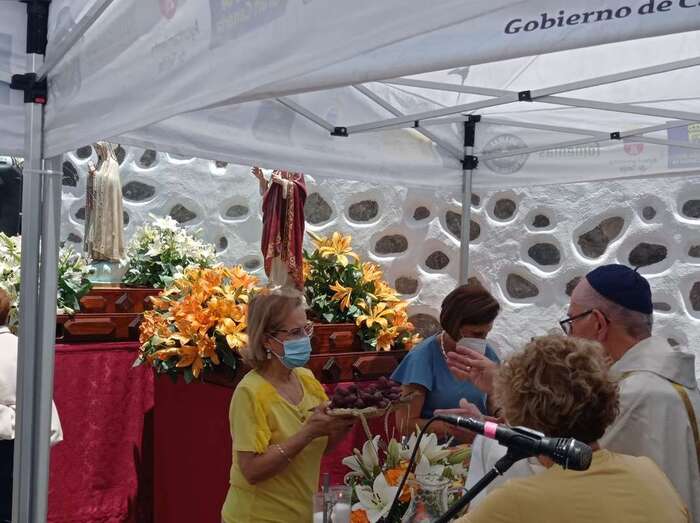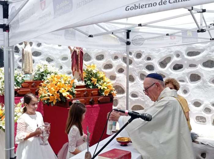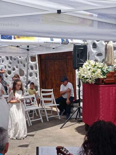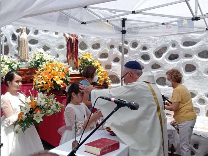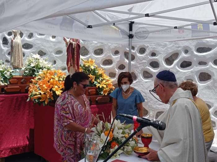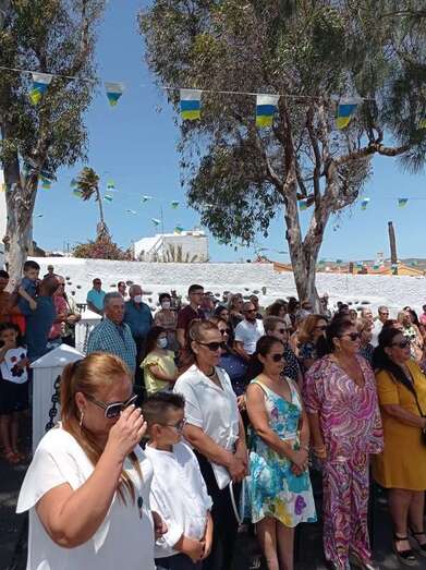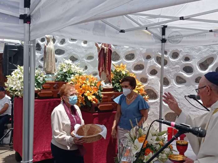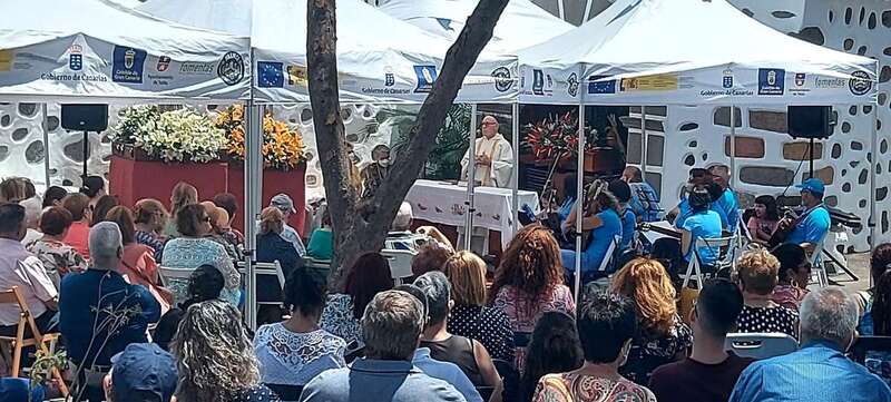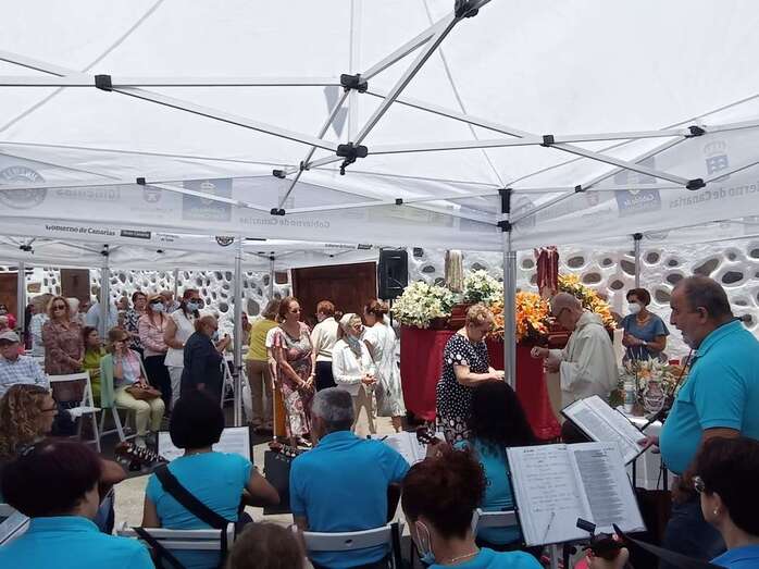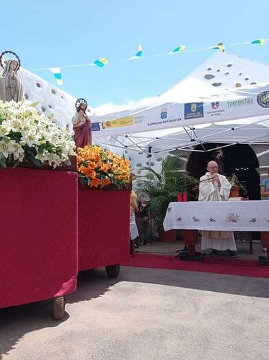 La eucaristía oficiada por el sacerdote José María Cabrera, párroco de San Juan y responsable pastoral de la zona, se celebró a partir de las 12.30 horas bajo unas carpas en la explanada a modo de plaza emplazada delante de la pequeña ermita.