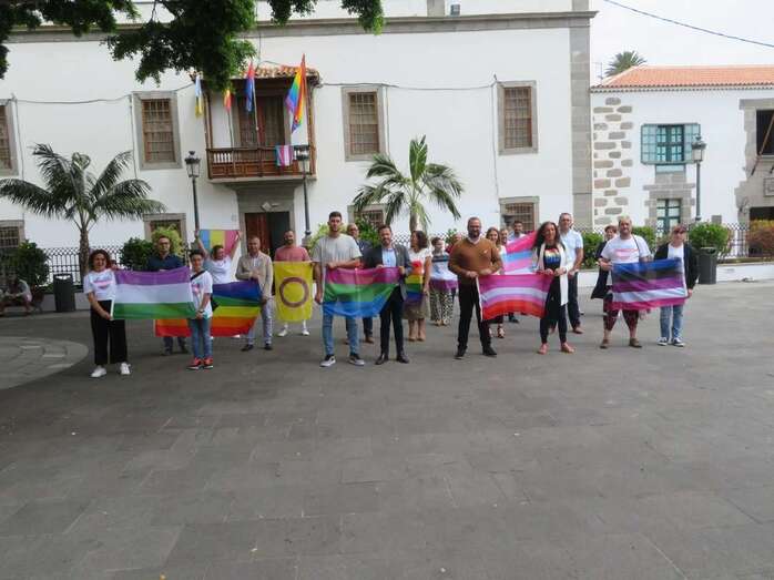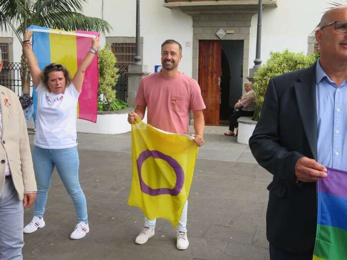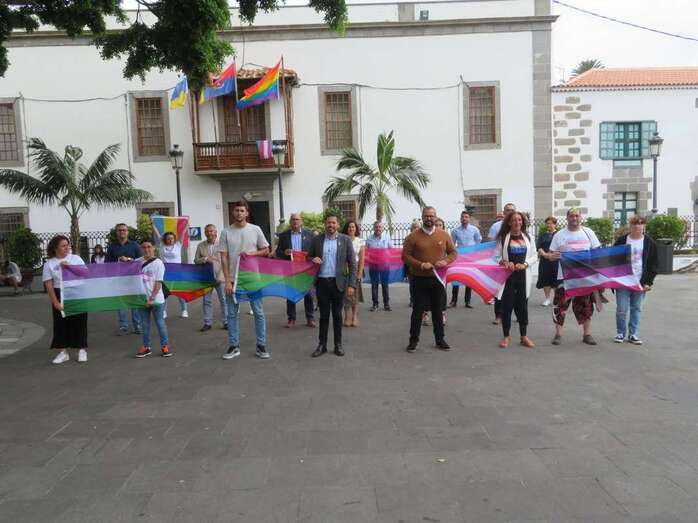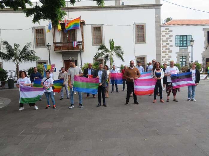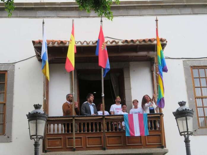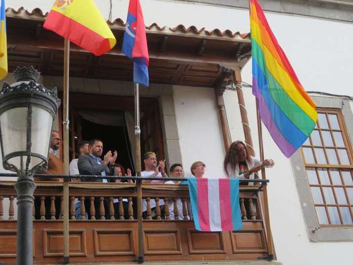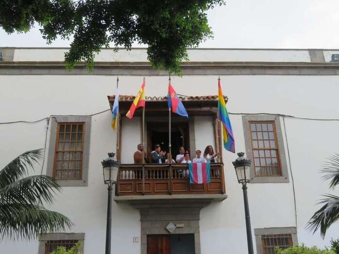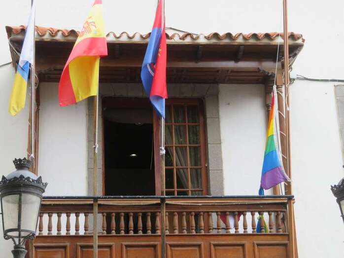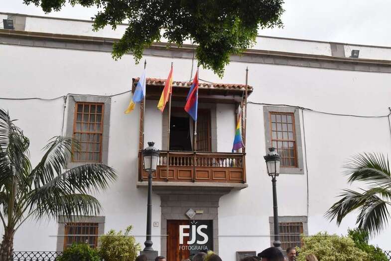 La bandera arcoíris ya ondea en el balcón de las Casas Consistoriales de Telde, en la plaza de San Juan, tras un acto en el que participaron el concejal de Políticas de Igualdad, Jonay López, y el vicealcalde Héctor Suárez, junto a otros miembros de la Corporación local y representantes de Gamá, Chrysallis Canarias, Equal LGTBIQ+ y Aranda LGTBIQ+.