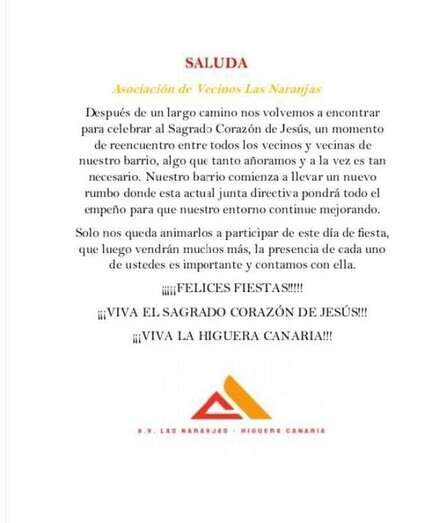 "Después de un largo camino nos volvemos a encontrar para celebrar al Sagrado Corazón de Jesús. Un momento de reencuentro entre todos los vecinos y vecinas de nuestro barrio, algo que tanto añoramos y a la vez es tan necesario. Nuestro barrio comienza a llevar un nuevo rumbo donde esta actual junta directiva pondrá todo el empeño para que nuestro entorno continue mejorando", destacan desde la Asociación de Vecinos Las Naranjas, colectivo que preside José González. "Solo nos queda animarlos a participar de este día de fiesta, que luego vendrán muchos más. La presencia de cada uno de ustedes es importante y contamos con ella", añaden.