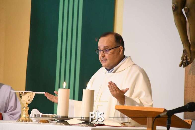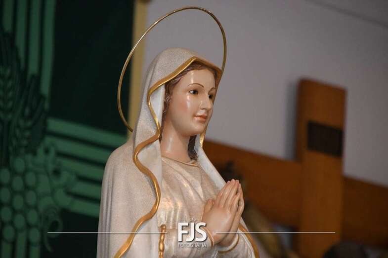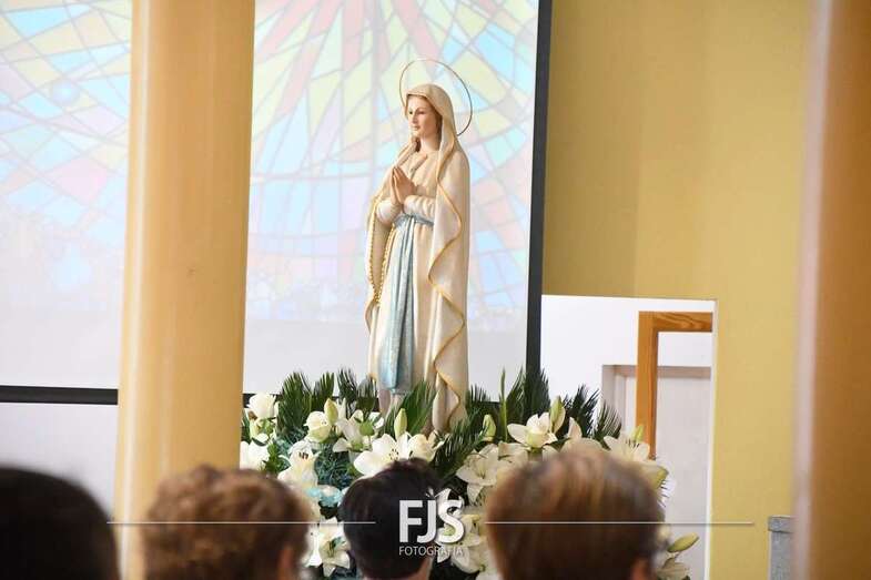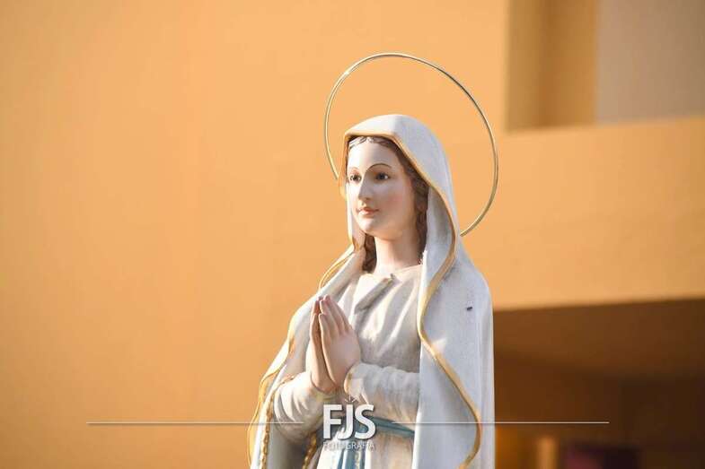 El regreso del trono de la Virgen de Lourdes a la iglesia fue saludado con una salva de voladores y el lanzamiento de pétalos de flores.