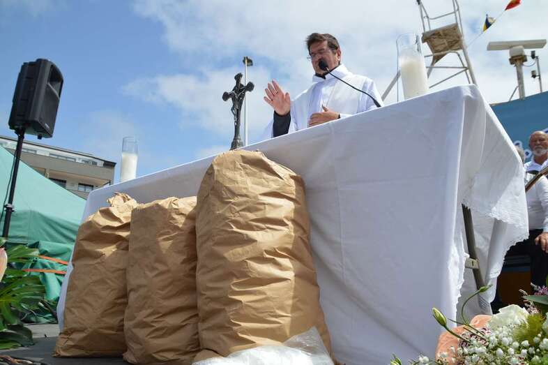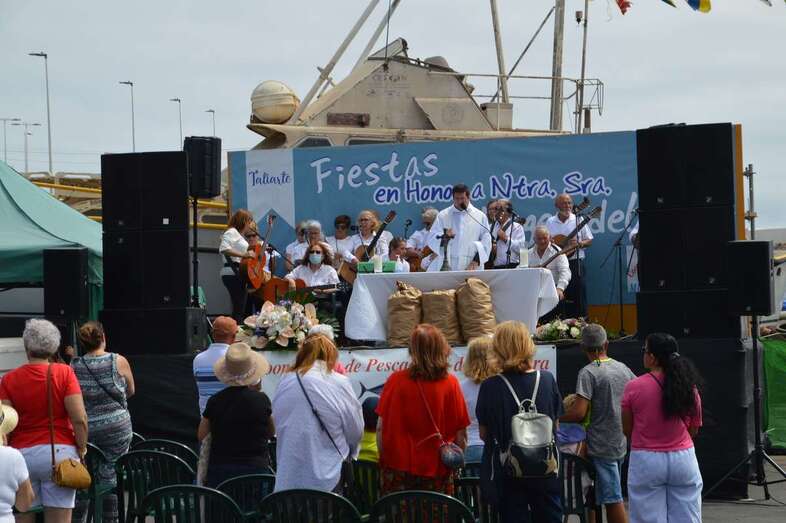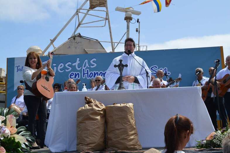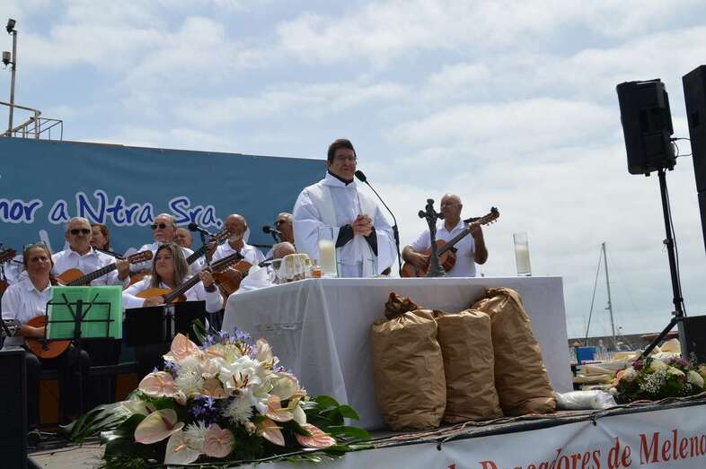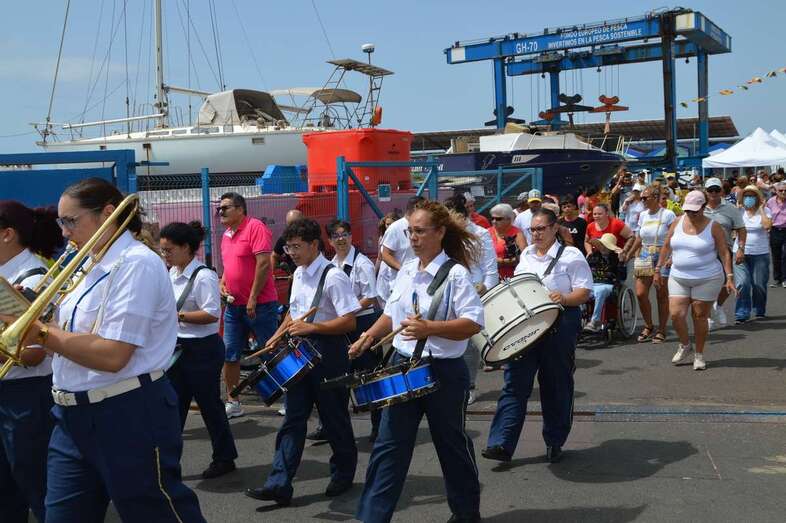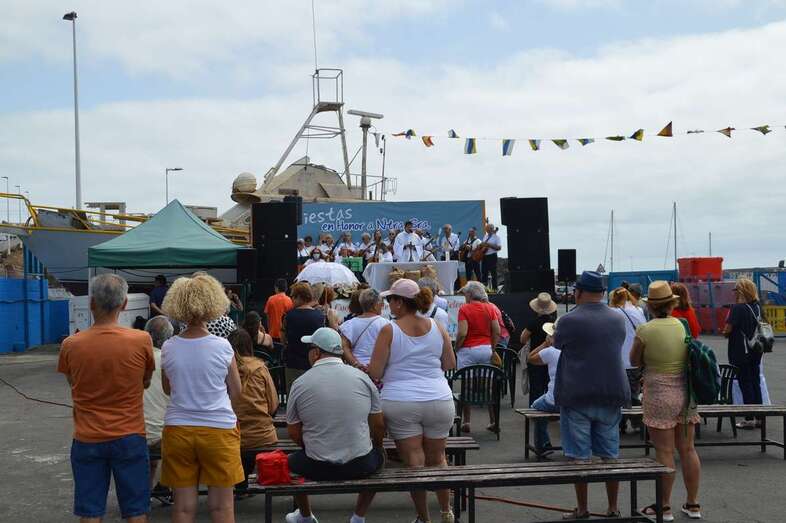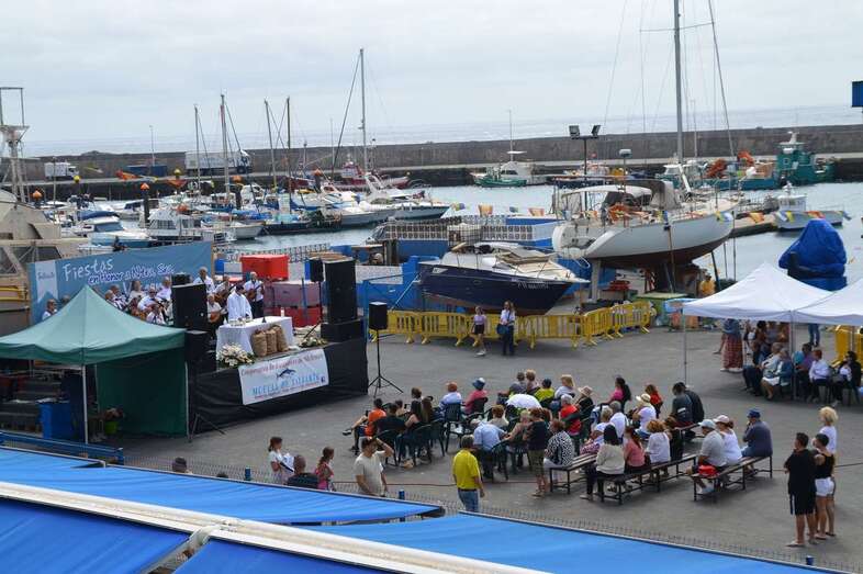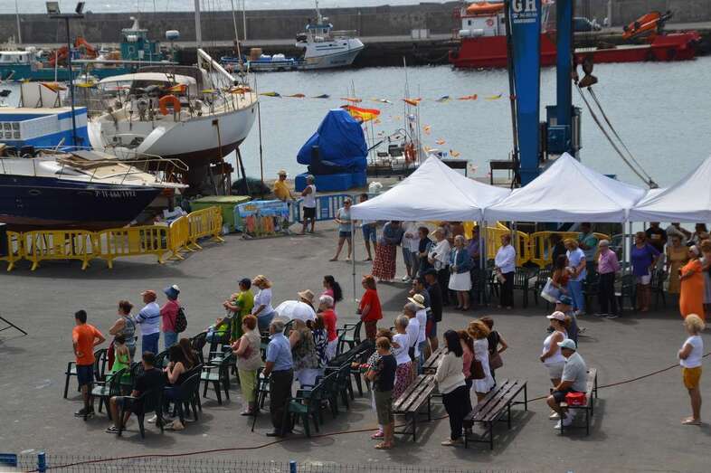 Cientos de personas se dieron cita a partir de las 11.00 horas en la explanada del muelle deportivo, pesquero y científico para asistir a la misa al aire libre y a pocos metros del mar oficiada por el párroco de la zona, Francisco Javier Martínez, y con el acompañamiento musical de la agrupación Los Llanos de San Gregorio de la Escuela Municipal de Folclore.