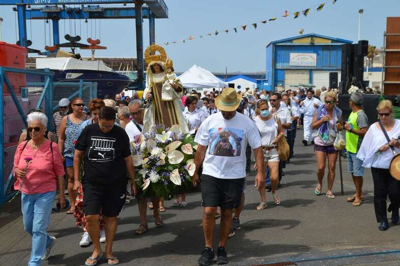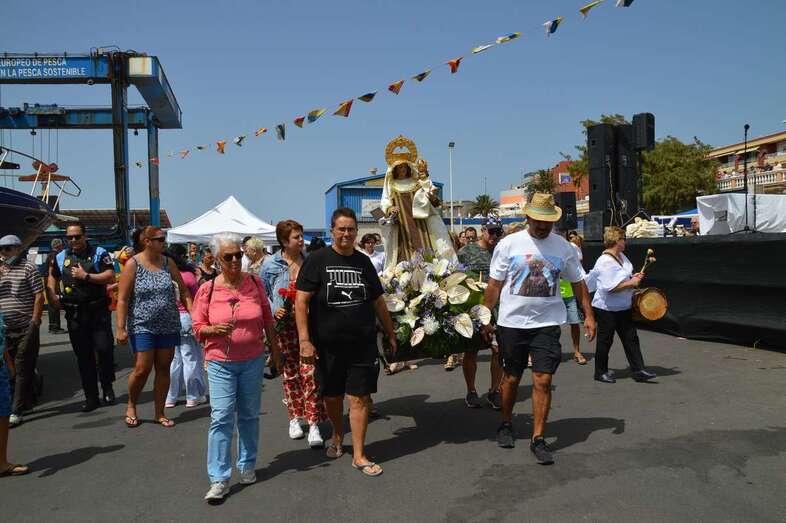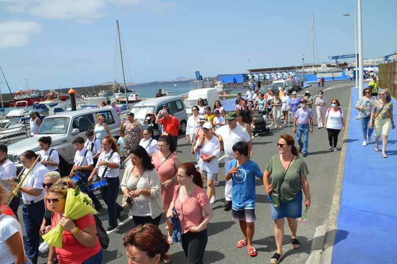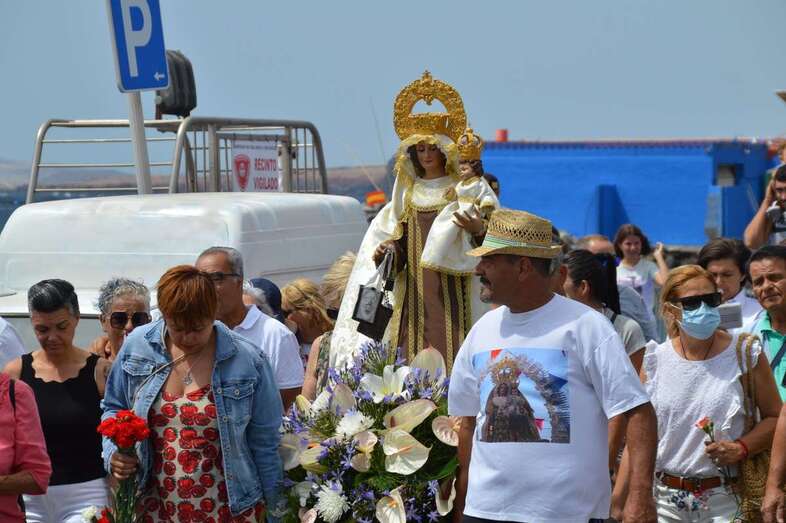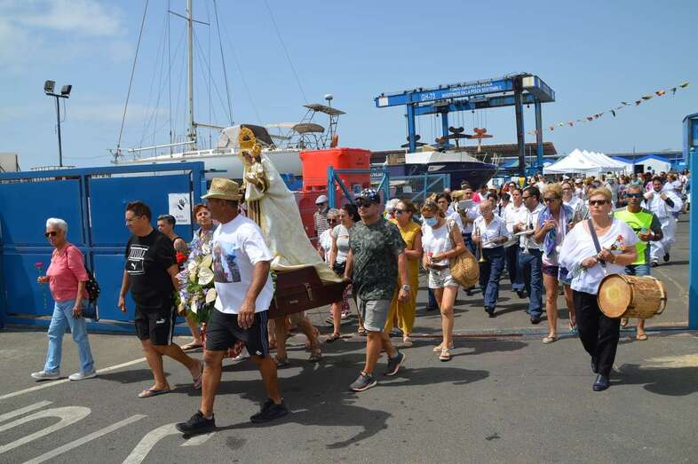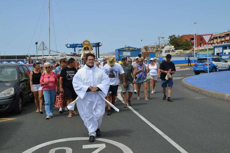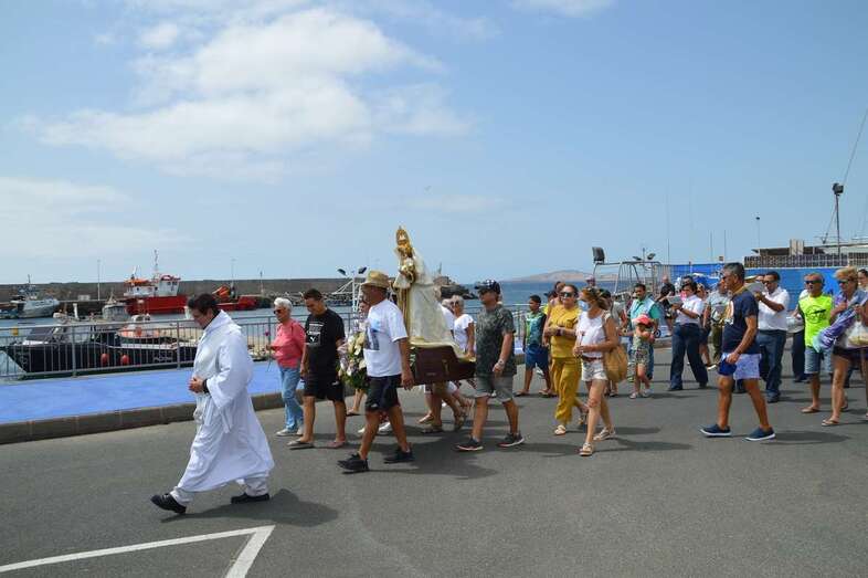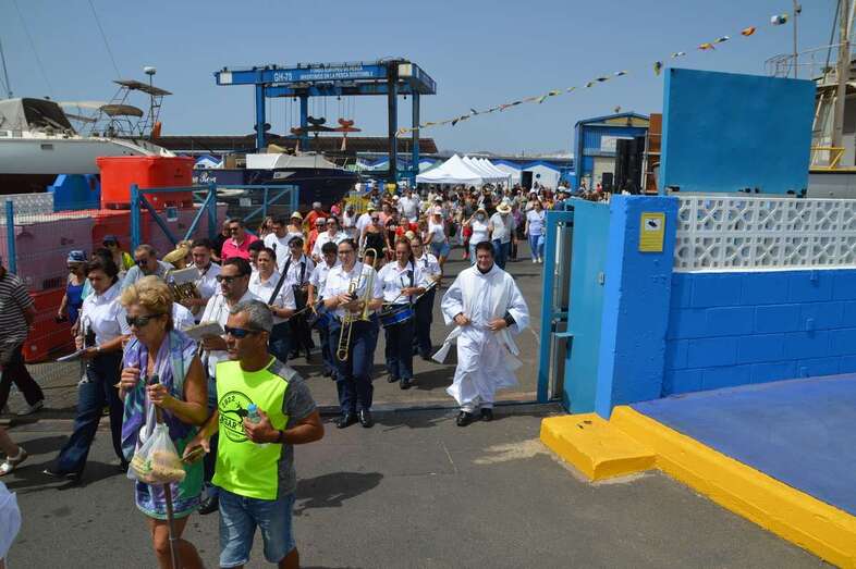 Tras la bendición y reparto de panes, al filo del mediodía, se puso en marcha el desfile religioso amenizado por una banda de tambores y cornetas La procesión realizó un periplo de ida y vuelta por el dique interior y exterior e hizo un alto en el camino, a la altura de las cuevas volcánicas situadas bajo el faro, para recibir una salva de voladores a cargo de la pirotecnia Piromart. Fueron frecuentes los gritos espontáneos alegóricos a la Virgen, y también al párroco, durante todo el recorrido por parte de feligreses.