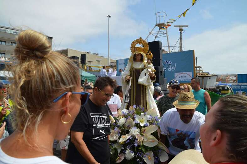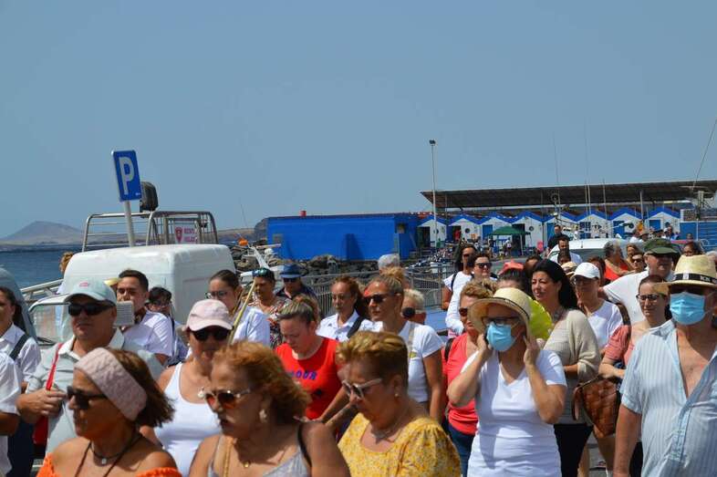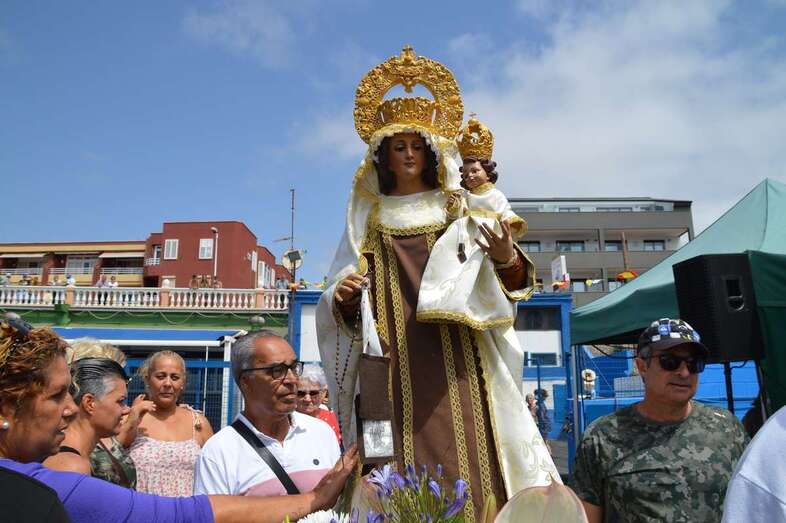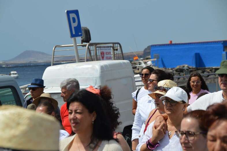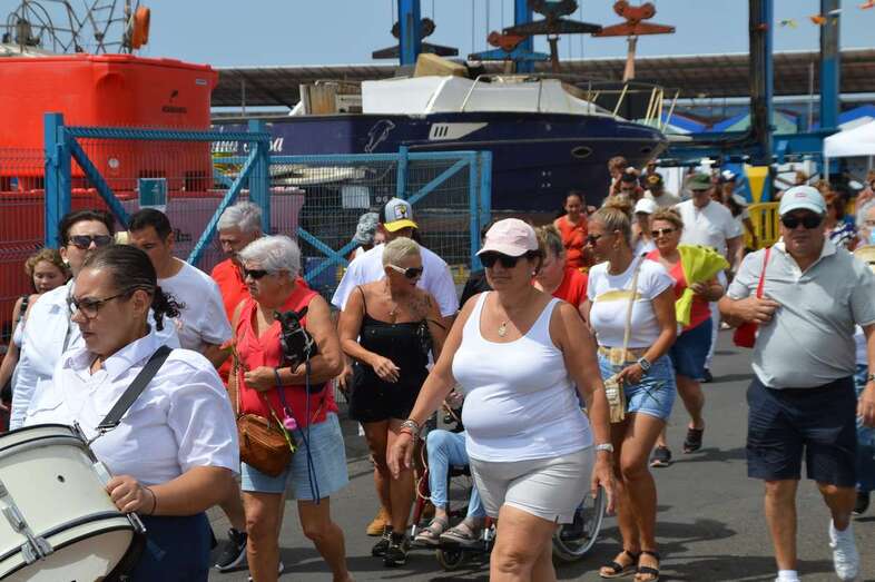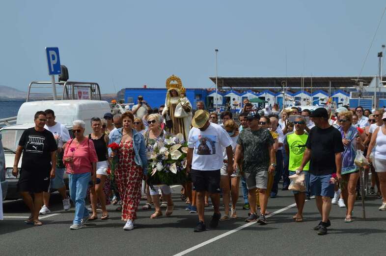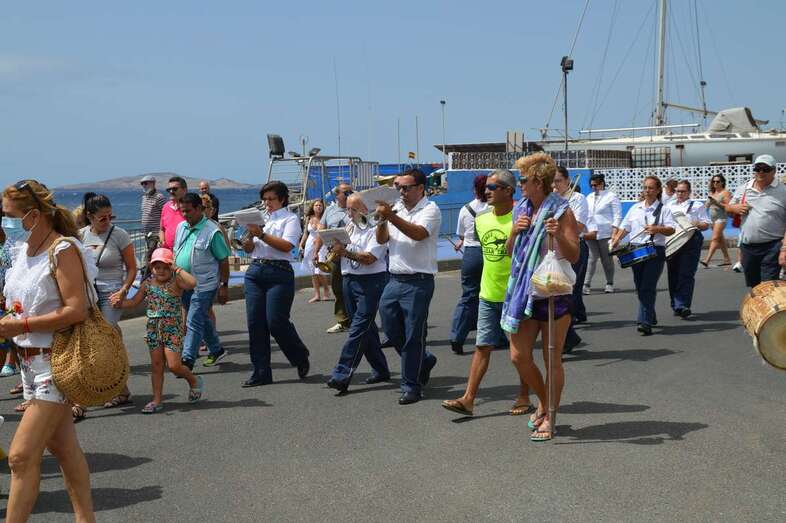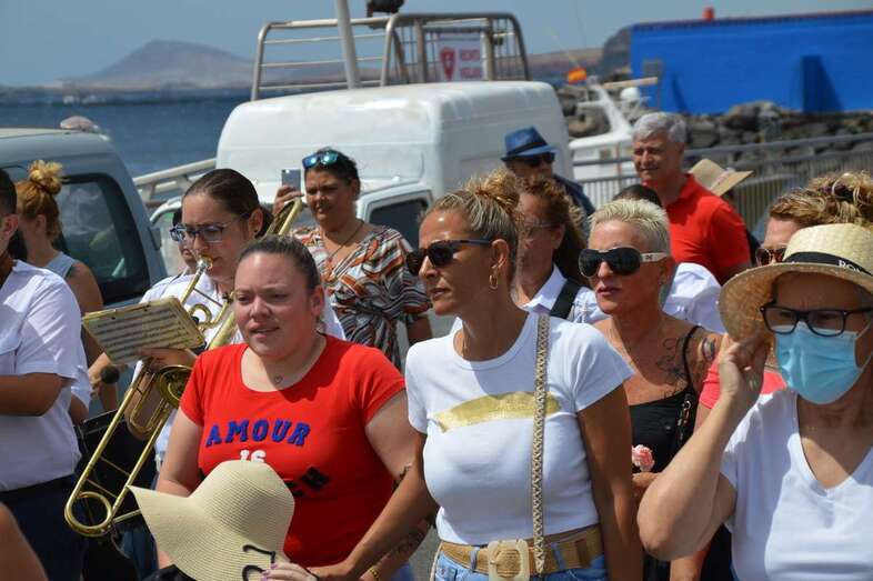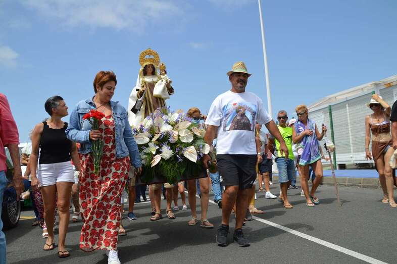 Tras la bendición y reparto de panes, al filo del mediodía, se puso en marcha el desfile religioso amenizado por una banda de tambores y cornetas La procesión realizó un periplo de ida y vuelta por el dique interior y exterior e hizo un alto en el camino, a la altura de las cuevas volcánicas situadas bajo el faro, para recibir una salva de voladores a cargo de la pirotecnia Piromart. Fueron frecuentes los gritos espontáneos alegóricos a la Virgen, y también al párroco, durante todo el recorrido por parte de feligreses.