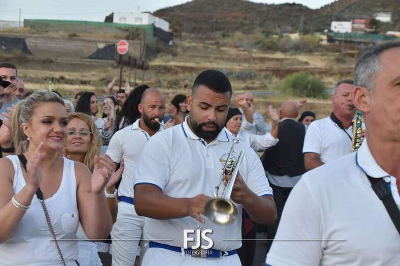 El periplo pachanguero comenzó a partir de las 7.00 horas en el cruce próximo a la Montaña de Los Barros, coronada como siempre por estas fechaspor una gran cruz encendida, y discurrió barrio abajo hasta el entorno de la plaza pública, donde los miembros de la Banda de Agaete tocaron en las inmediaciones del templo para hacerle llegar su música a la patrona del barrio y Alcaldesa Perpetua de Telde.