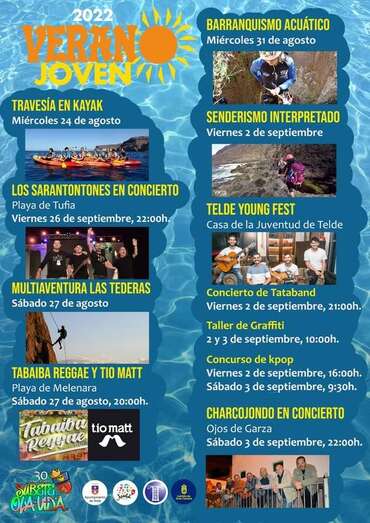 Actividades acuáticas, senderismo, los conciertos de Sarantontones, Tabaiba Reggae y Tío Mat, Tataband y Charcojondo, un taller de grafiti y un concurso de K-pop centran este año los actos del programa Verano Joven 2022 para cerrar el mes de agosto. Se trata una iniciativa incluida en la campaña ‘Súbete a la ola de la vida’ que este año celebra su 30º aniversario y que continuará durante el mes de septiembre.