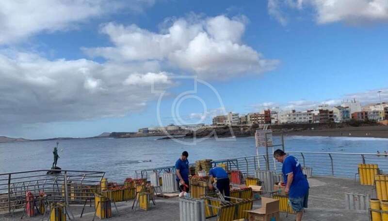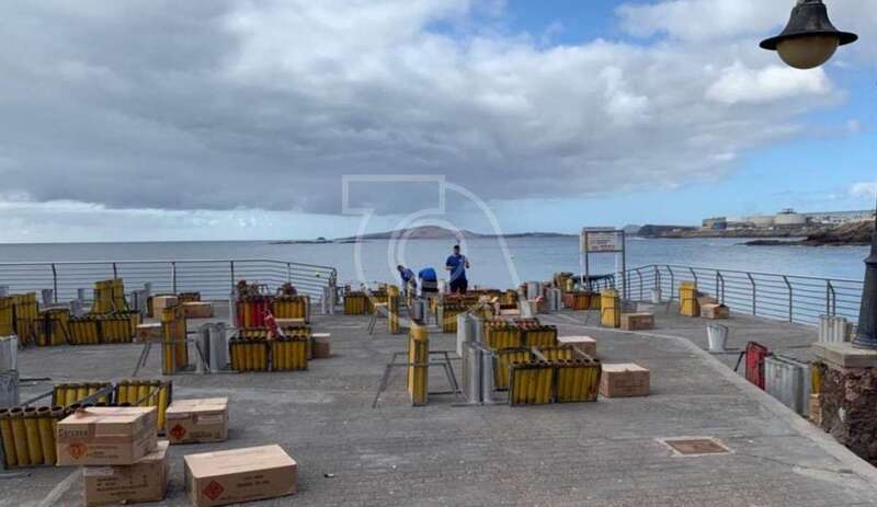 Desde primera hora de este sábado se perimetraba el área del antiguo muelle de Melenara, desde donde se efectuarán los disparos terrestres y en donde la empresa pirotécnica ya tiene dispuestas las carcasas con los fuegos artificiales.