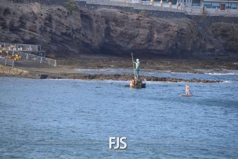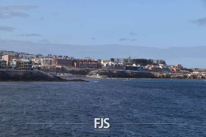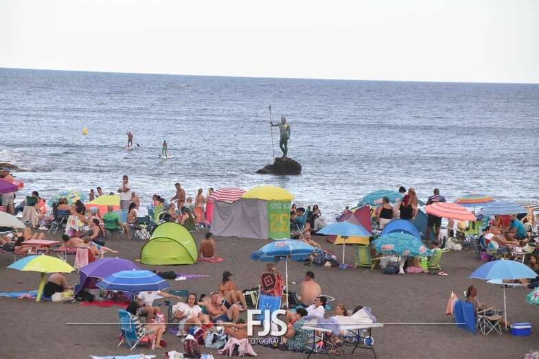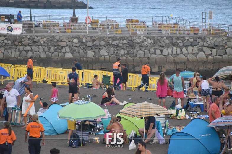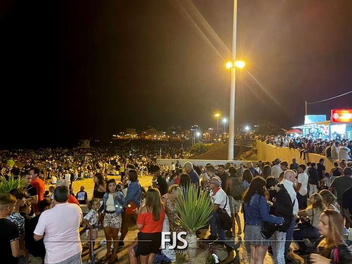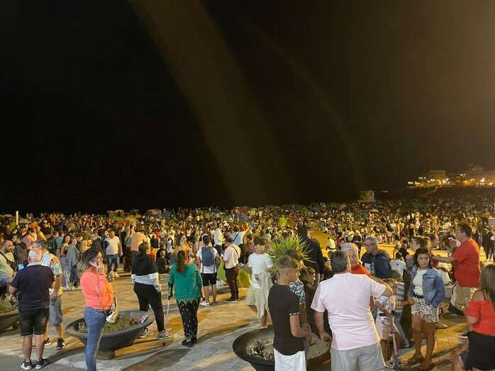 La popular playa teldense, atiborrada de público de todas las edades apostado en la arena y la avenida marítima, asistió a unos fuegos artificiales terrestres y acuáticos, lanzados desde el espigón del antiguo muelle y desde el mar por la empresa teldense Piormart, que dibujaron a casi 70 metros de altura y durante unos 15 minutos variopintas estampas cromáticas y dejaron en el ambiente un olor a pólvora.