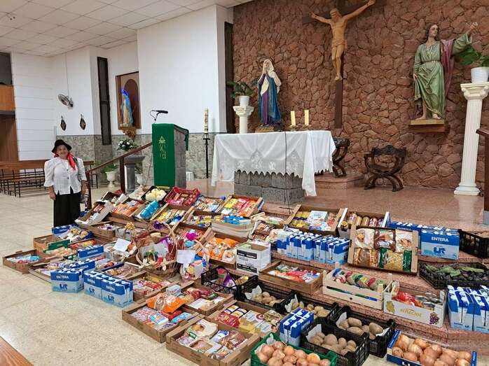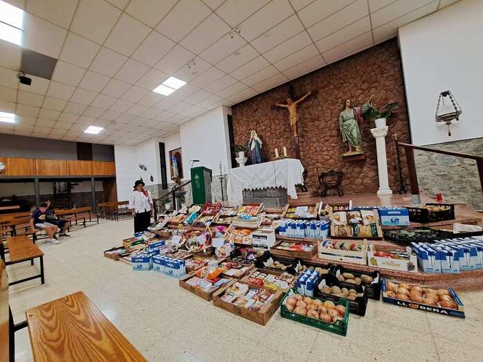 La Parroquia del Sagrado Corazón de Jesús abrió anoche por primera vez sus puertas a la romería organizada por el colectivo Patronato La Sal para recoger los productos ofrendados por sus participantes.
