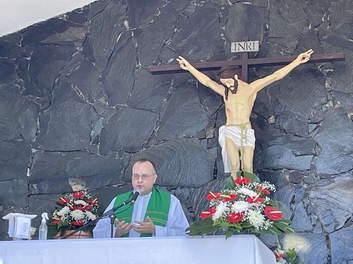 A las 12:00 de mediodía, como todos los años, los vecinos congregados en la Plaza del Cristo pudieron escuchar la Misa oficiada por al Párroco de Santa Rita, D. Benjamín Raírez. Una homilía cargada de mucho mensaje que invitaba a los vecinos a la comunicación y la buena convivencia y a salvar las diferencias por mor de ser mejores y más fuertes. También hubo un hermoso recuerdo para D. Juan Pedro Pérez Medina, presidente de la AV Playgarza y que por motivos de salud no pudo acudir, si bien estuvo en la mente de todos los presentes que oraron por su pronta recuperación.