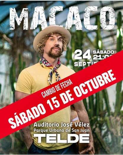 El Ayuntamiento de Telde ha anunciado el aplazamiento del concierto que el cantante Macaco iba a ofrecer este sábado en el parque urbano de San Juan. Una decisión que obedece a la previsión de que Canarias se vea afectada en las próximas horas por fenómenos meteorológicos adversos, con episodios de fuertes lluvias, por la influencia de un ciclón tropical.
