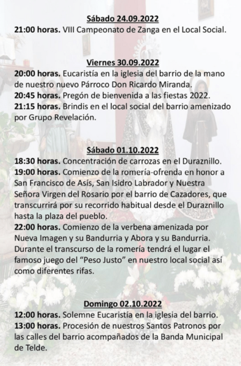 Si bien el VIII Campeonato de Zanga arrancará el sábado 24 de septiembre (21.00 horas) en el local social, no será hasta el siguiente fin de semana, hasta el viernes 30 de septiembre, cuando los fastos arranquen de manera oficial. Y lo harán con una eucaristía (20.00 horas) a cargo de Ricardo Miranda, recientemente designado párroco de Cazadores, el pregón (20.45 horas) y un brindes amenizado por el Grupo Revelación (21.15 horas).