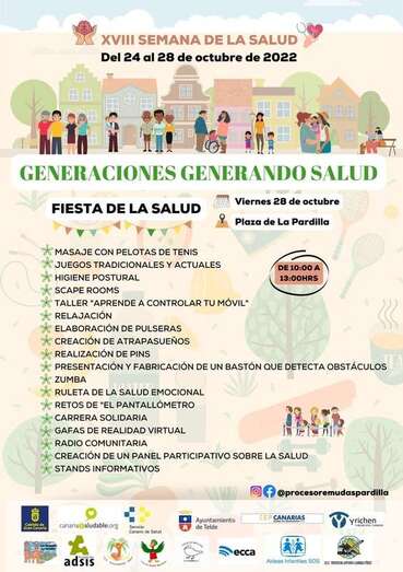 La iniciativa, que se celebra bajo el lema Generaciones generando salud, incluye diversas actividades y talleres como masaje con pelotas de tenis, juegos tradicionales y actuales, higiene postural, scape rooms, aprende a controlar tu móvil, relajación, elaboración de pulseras, creación de atrapasueños, realización de pins, presentación y fabricación de un bastón que detecta obstáculos, zumba, ruleta de la salud emocional, retos de el pantallómetro, carrera solidaria, gafas de realidad virtual, radio comunitaria, creación de un panel participativo sobre la salud y varios stands informativos. También hubo un concierto de la Banda Municipal de Música en el local social del colectivo Las Mansas.