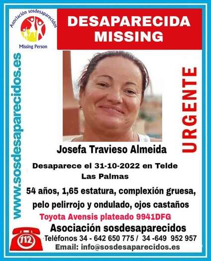 Josefa Travieso Almeida mide 1,65 de estatura, complexión gruesa, tiene pelo pelirrojo y ondulado y ojos castaños. Su coche es un Toyota Avensis plateado con matrícula 9941DFG.