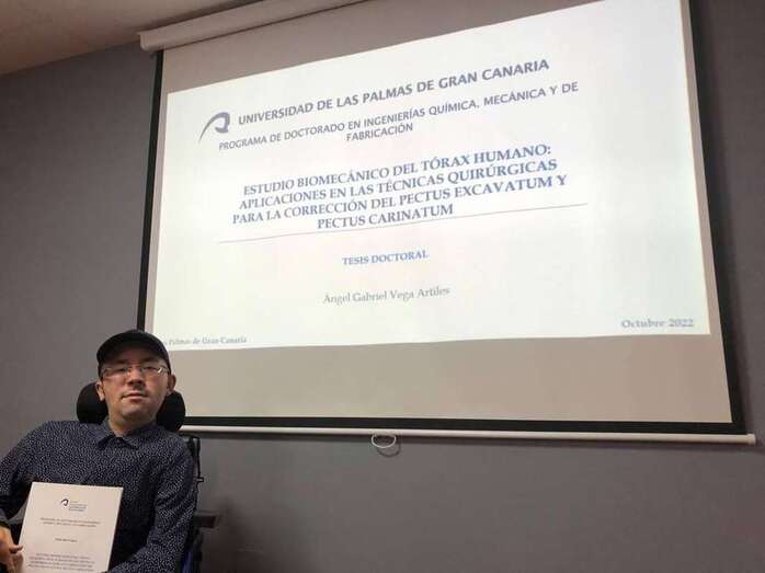 El alumno de la Universidad de Las Palmas de Gran Canaria (ULPGC) Ángel Gabriel Vega Artiles, de Telde, que padece una gran discapacidad motora, ha culminado su doctorado con una tesis en la que aborda el estudio computacional de la técnica de Nuss, un tipo de cirugía torácica.