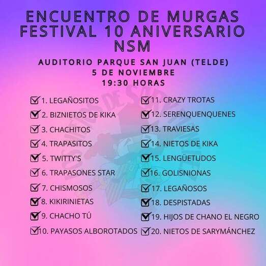 La murga teldense Los Nietos de SaryMánchez celebró este sábado su décimo aniversario por todo lo alto con un encuentro musical y festivo de agrupaciones carnavaleras en el Auditorio José Vélez del Parque Urbano de San Juan.