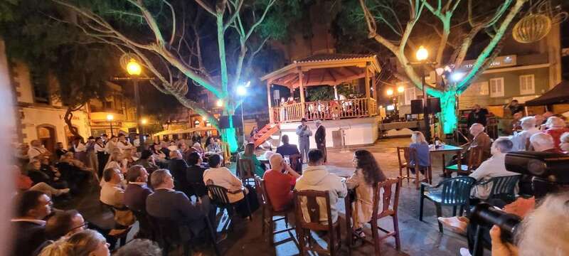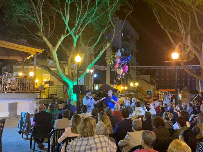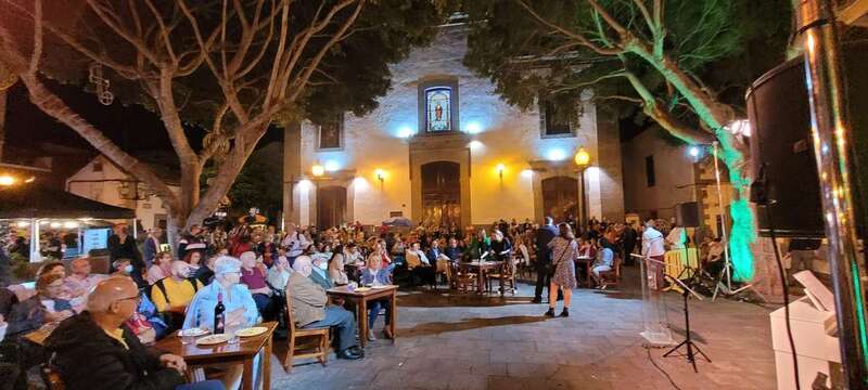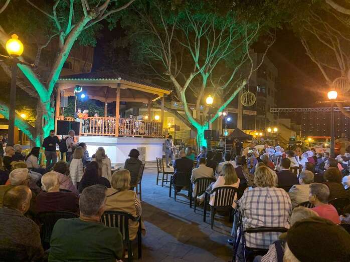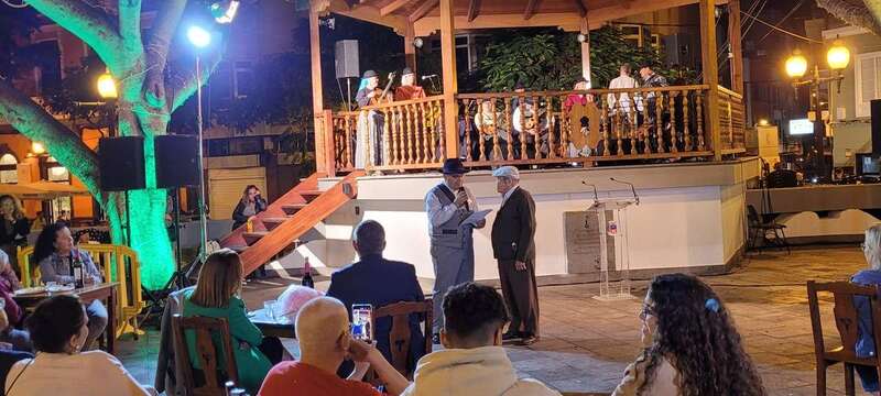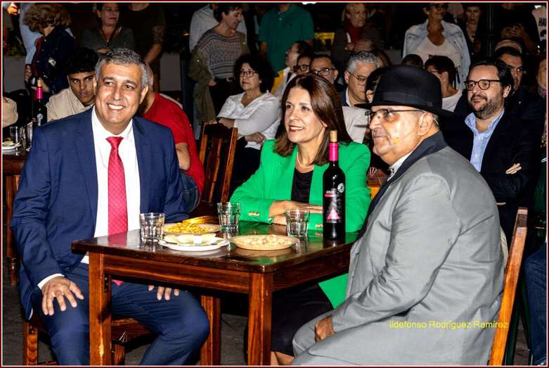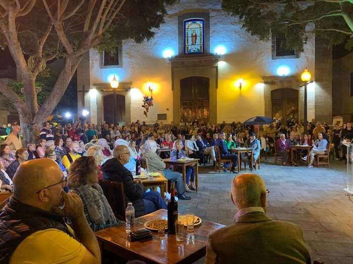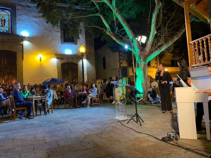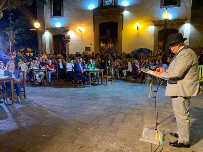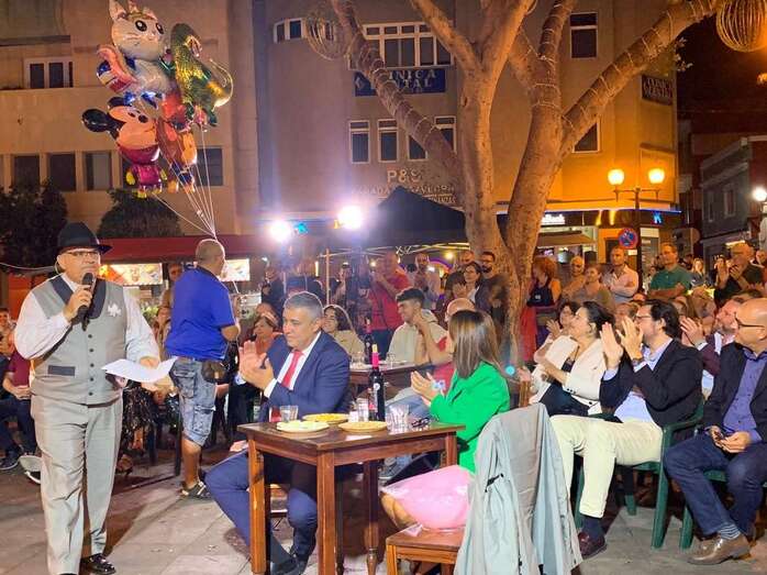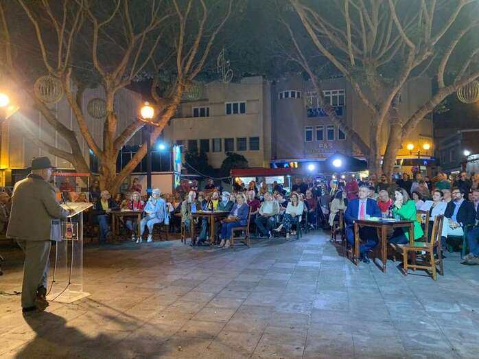 El escenario emuló a un tenderete de la época, con mesas y sillas repartidas por diferentes rincones de la plaza de Los Llanos, Alberto Alejandro Benítez fue recorriendo alternando la lectura del texto con música y bailes en directo ante una nutrida asistencia de público conformado por vecinos, amigos y una amplia representación de autoridades públicas encabezada por la alcaldesa Carmen Hernández e integrada por ediles del Gobierno (Servando González, Celeste López, Agustín Arencibia, Sergio Suárez, Eloy Santana, Álvaro Monzón, entre otros) y de la oposición (Sonsoles Martín y María Eugenia Melián, del PP, Héctor León, del PSOE, y César Santana, de Unidas Podemos). También asistió el senador Sergio Ramos, candidato del PP a la Alcaldía de Telde aún pendiente de su nombramiento oficial.