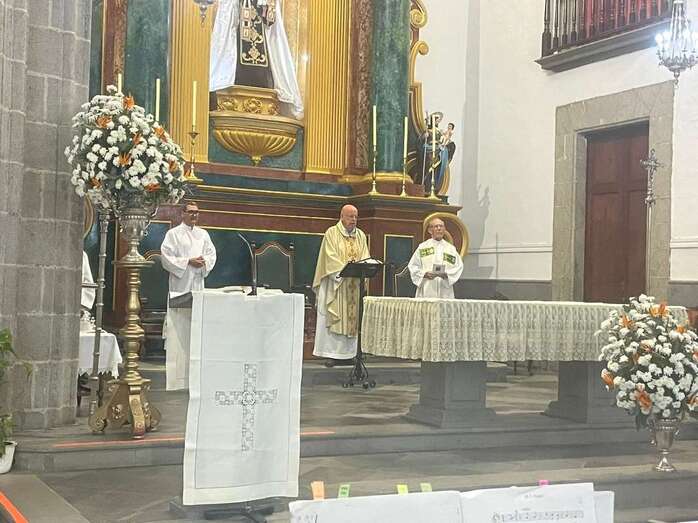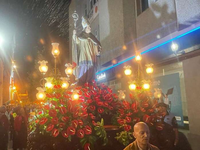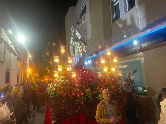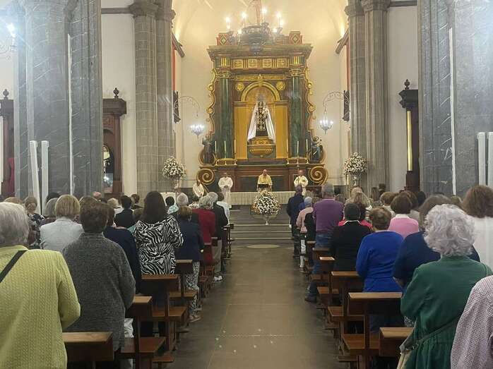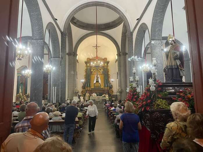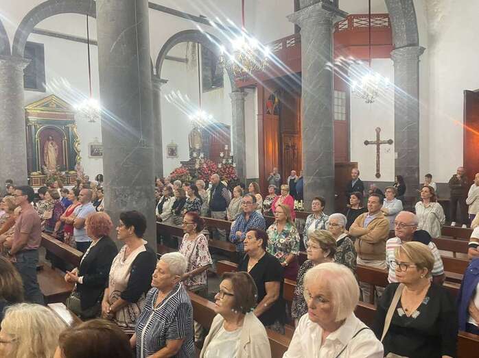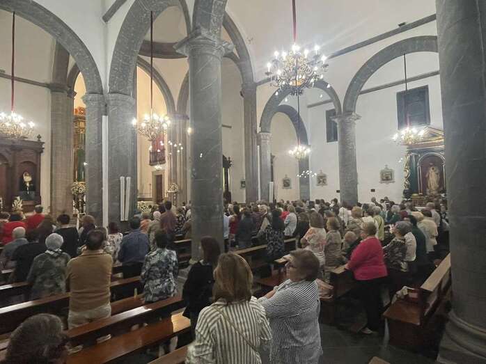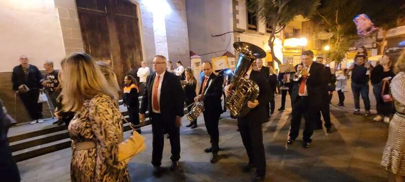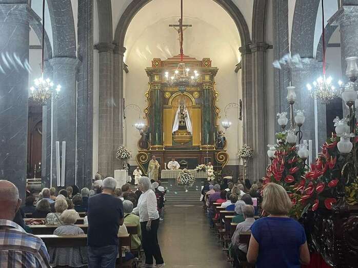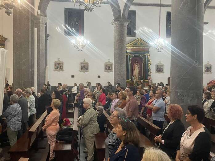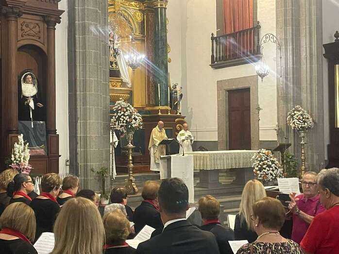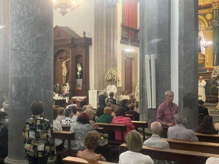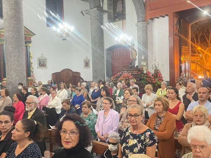 El trono que lucía un llamativo adorno floral de anturios color rojo y esterlicia regina con hojas de schefflera arborícola y eucaliptos, obra del diseñador teldense Segundo Amador, irrumpía por la puerta del neoclásico delineado por el arquitecto Diego Nicolás Eduardo pasadas las 20.00 horas, tras acabar la solemne eucaristía concelebrada por varios sacerdotes del Arciprestazgo de Telde y predicada por el diacono permanente, Francisco López. El coro Nuestra Señora de Fátima de El Calero animó con sus cánticos la misa.