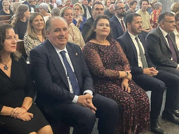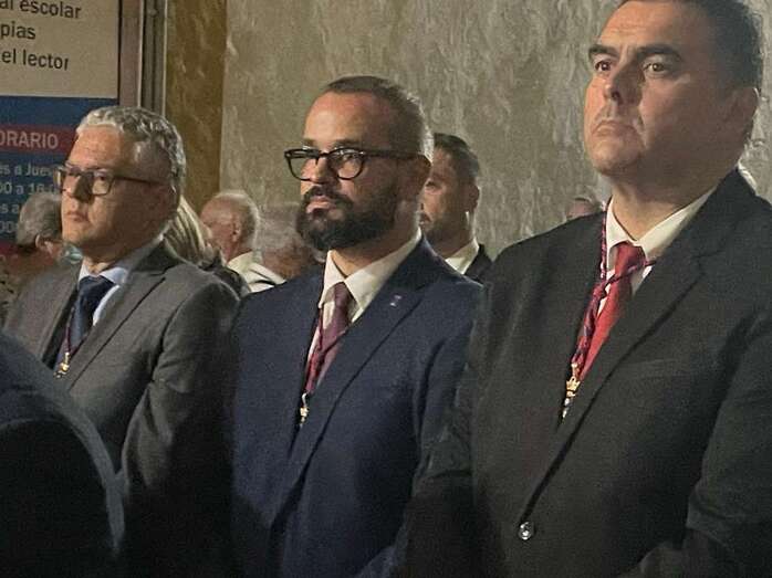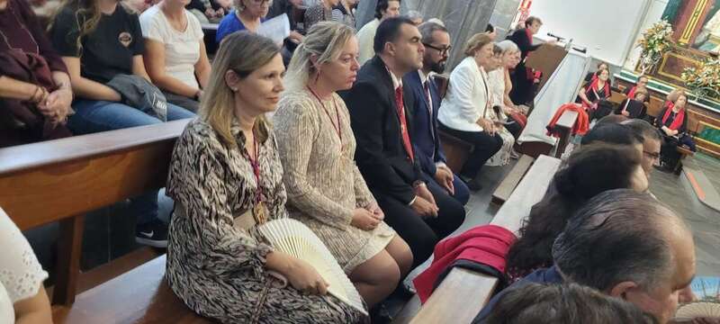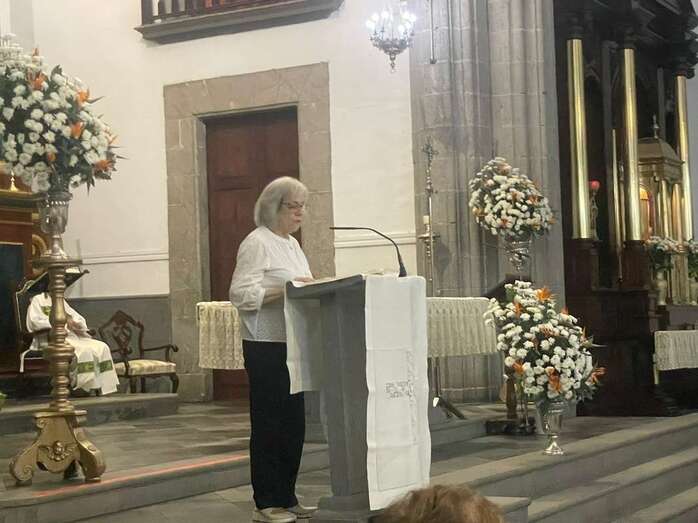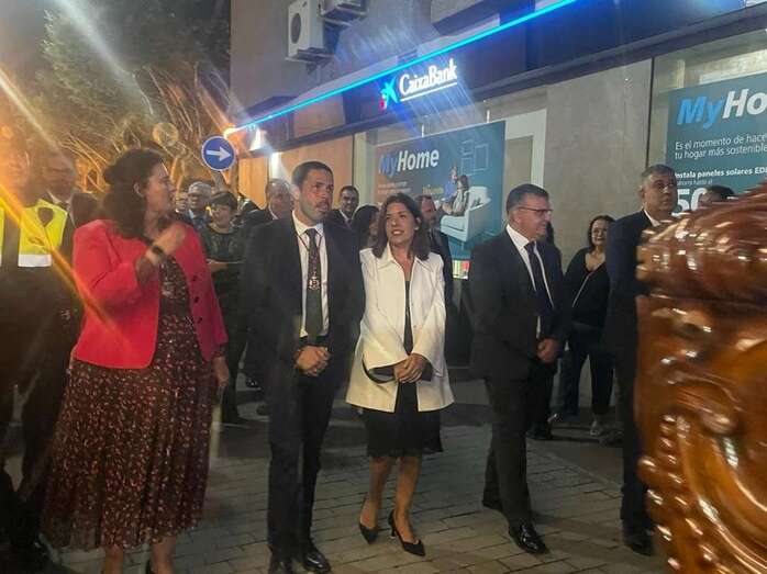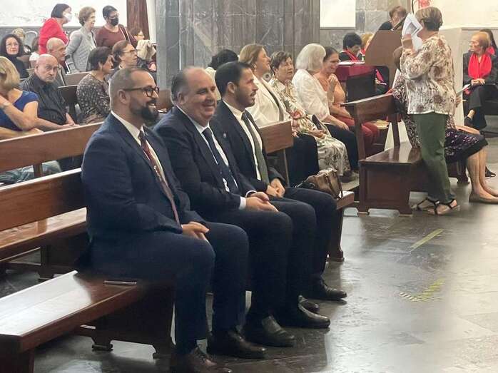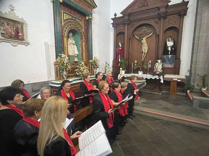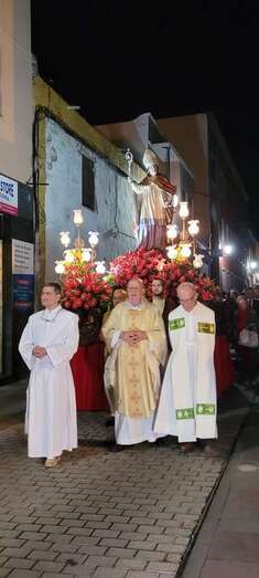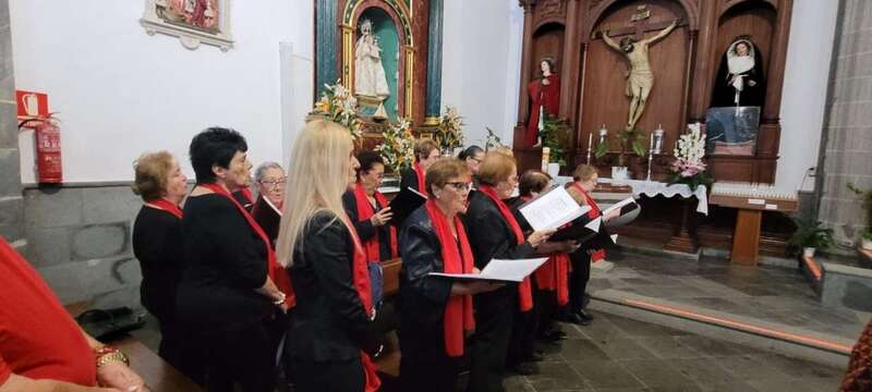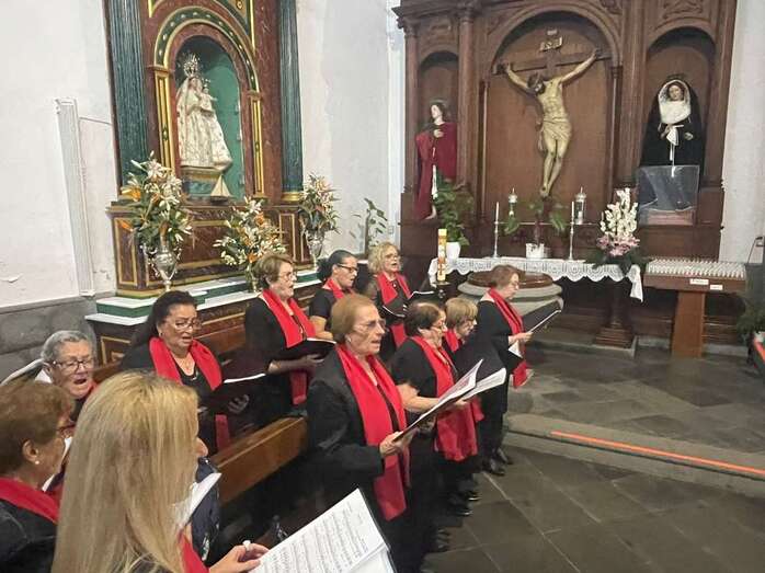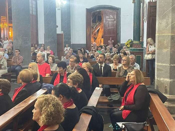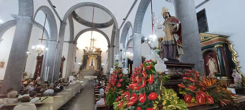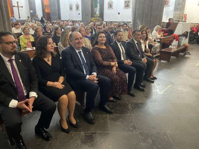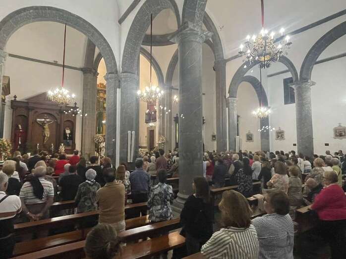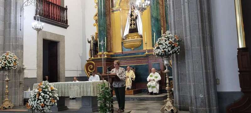 El trono que lucía un llamativo adorno floral de anturios color rojo y esterlicia regina con hojas de schefflera arborícola y eucaliptos, obra del diseñador teldense Segundo Amador, irrumpía por la puerta del neoclásico delineado por el arquitecto Diego Nicolás Eduardo pasadas las 20.00 horas, tras acabar la solemne eucaristía concelebrada por varios sacerdotes del Arciprestazgo de Telde y predicada por el diacono permanente, Francisco López. El coro Nuestra Señora de Fátima de El Calero animó con sus cánticos la misa.