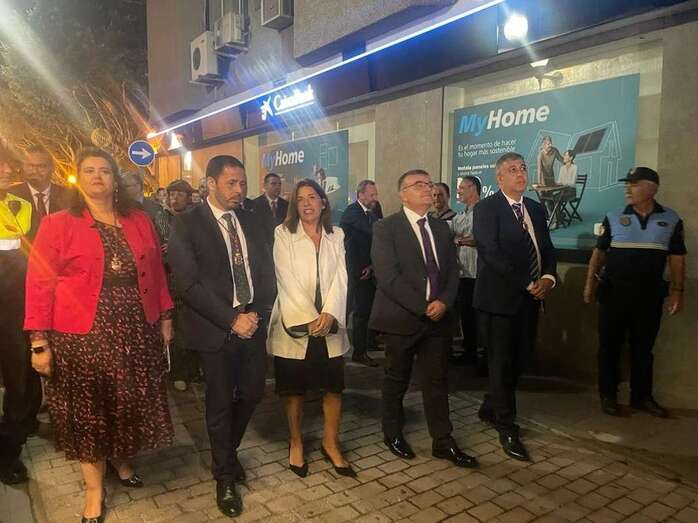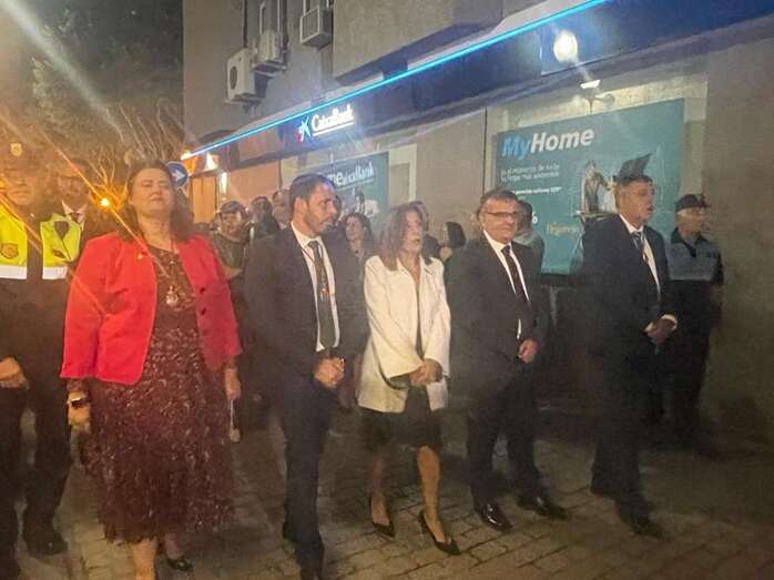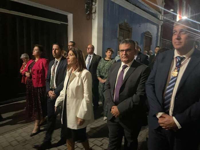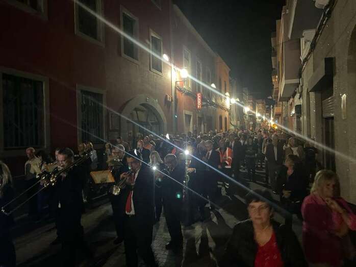 La bella talla de San Gregorio, compatrono de la ciudad, procesionó esta noche por las calles de Los Llanos de Telde, acompañada de feligreses, autoridades encabezadas por la alcaldesa Carmen Hernández, el pregonero de las fiestas Alberto Alejandro y la Banda Municipal de Música.