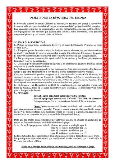 El domingo 11 de diciembre de 2.022 los equipos inscritos se presentarán en la Plaza de Jinámar, a las 10:00 horas para comenzar la Búsqueda del Tesoro y tendrán que localizar determinados lugares y personajes donde encontrarán pistas y se desarrollarán juegos tradicionales, que puntuarán para nominar al equipo ganador.