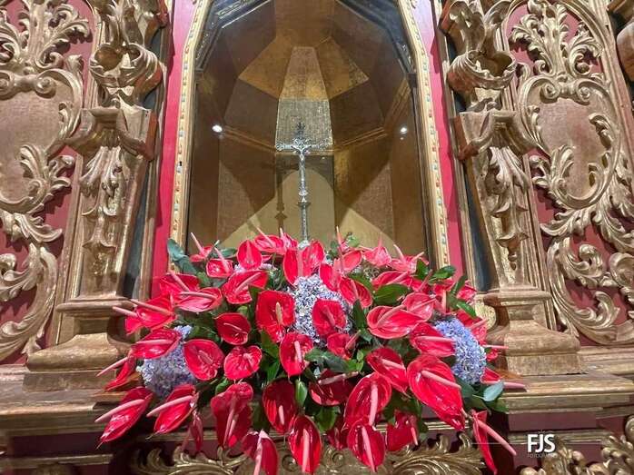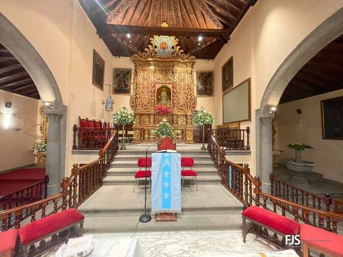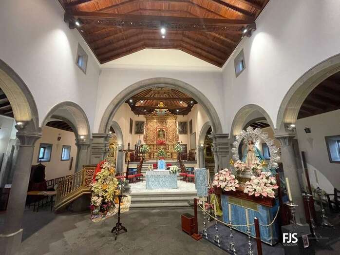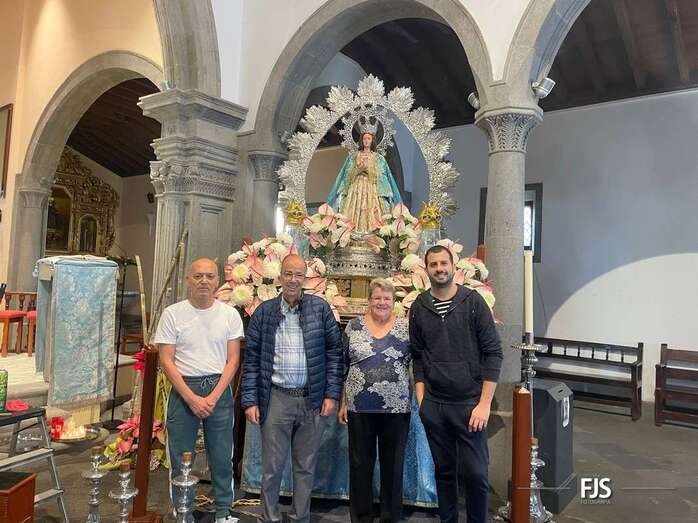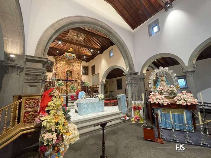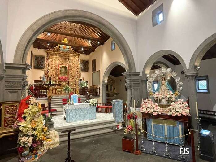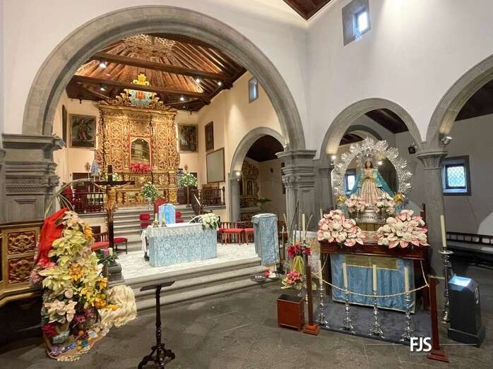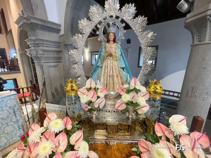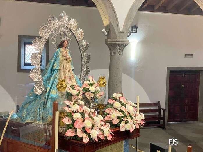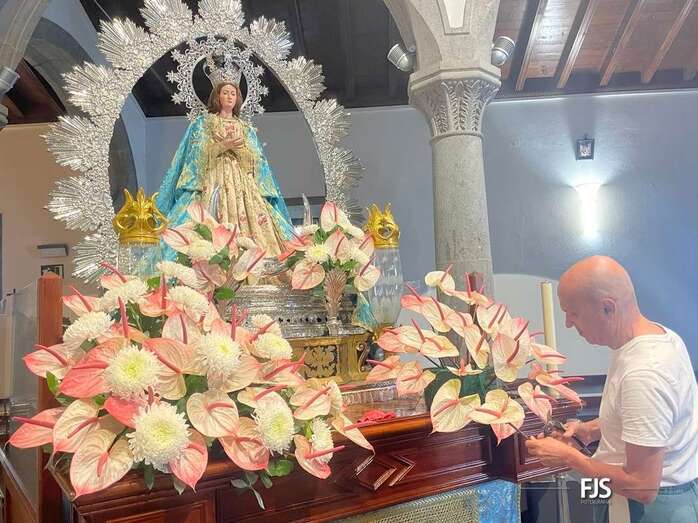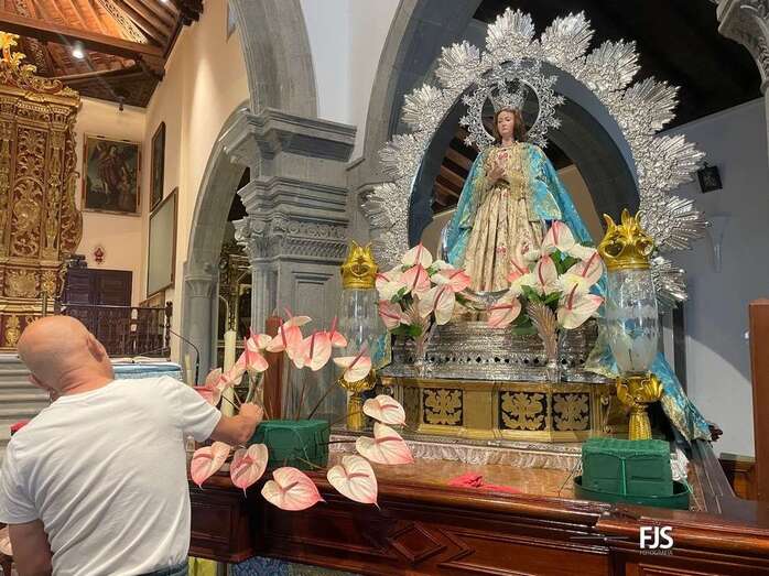 El trono de la Inmaculada Concepción luce ya un precioso arreglo floral que exhibirá este jueves durante los oficios religiosos en el interior del templo y en la procesión que tendrá lugar por las calles del pueblo de Jinámar después de la solemne misa del mediodía que será presidida por el obispo José Mazuelos.