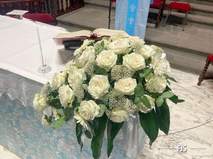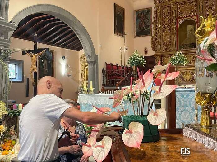 La cuidada ornamentación, obra del conocido diseñador teldense Segundo Amador y de su equipo, enlaza anthurium color rosa pálido con crisantemo magnum blancos combinadas con hojas de eucaliptos.