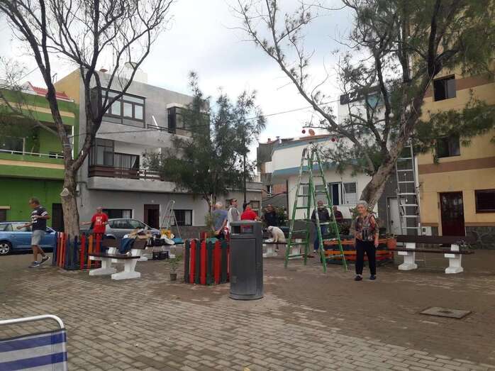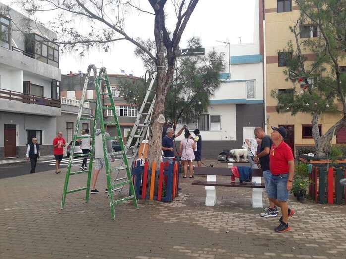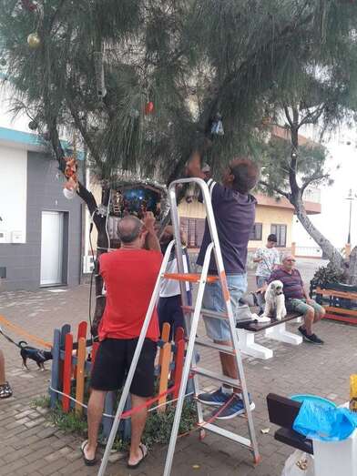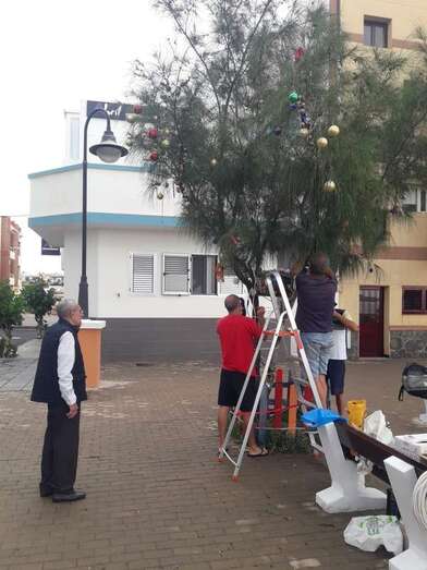 Un grupo de vecinos de Clavellinas colocó durante la jornada de este jueves festivo la iluminación multicolor y decoración navideña en los árboles de la conocida como Plaza de Los Pinos, una iniciativa ciudadana que se viene repitiendo desde hace años por estas fechas.