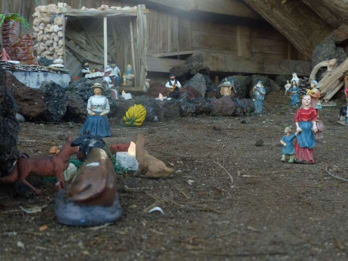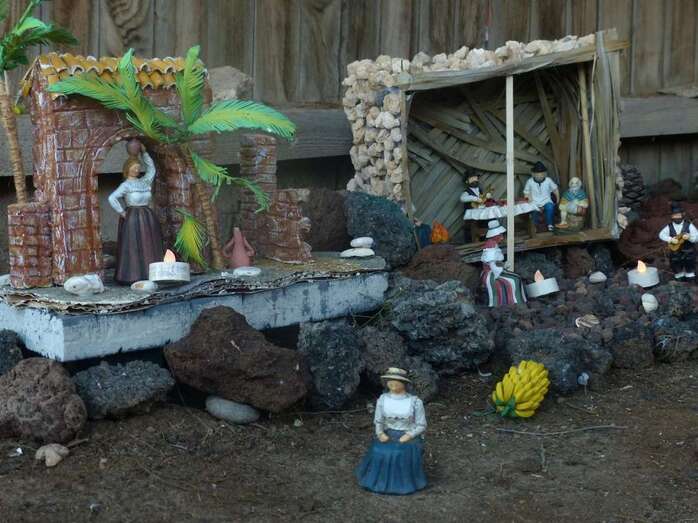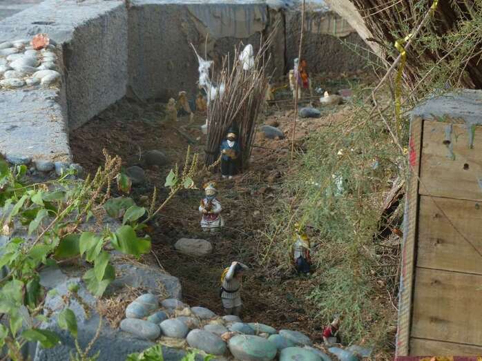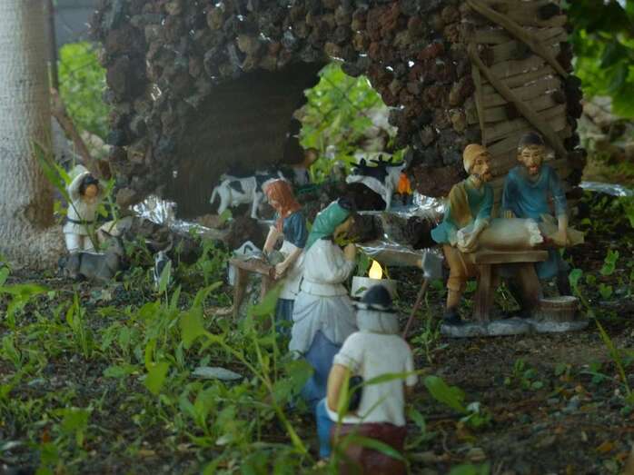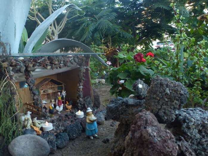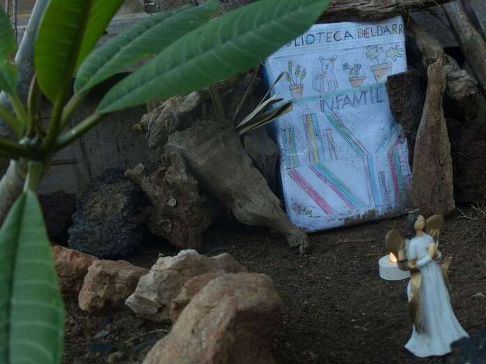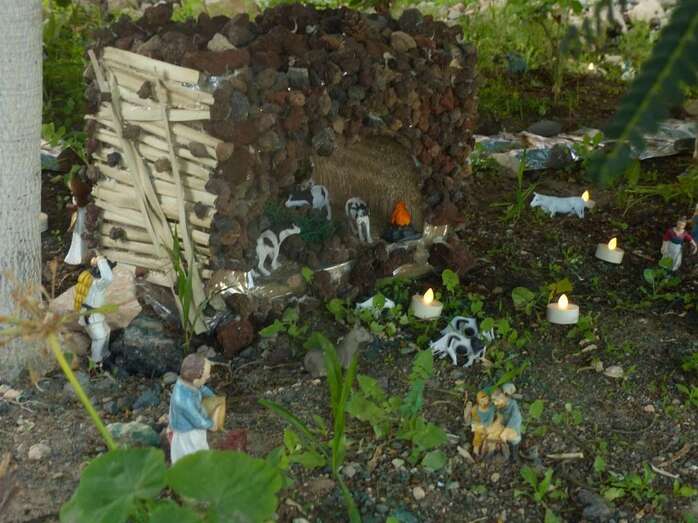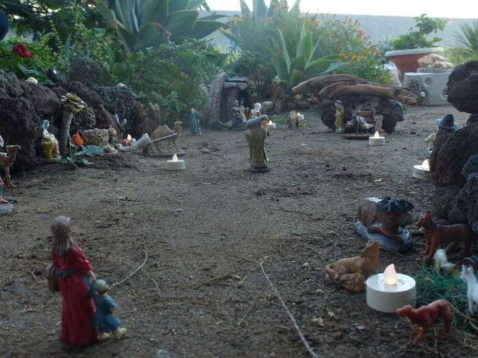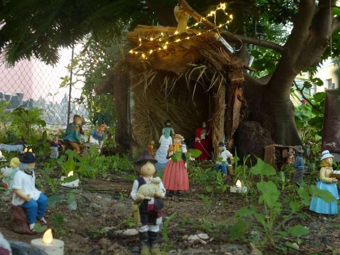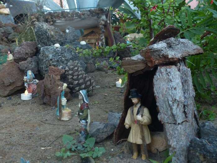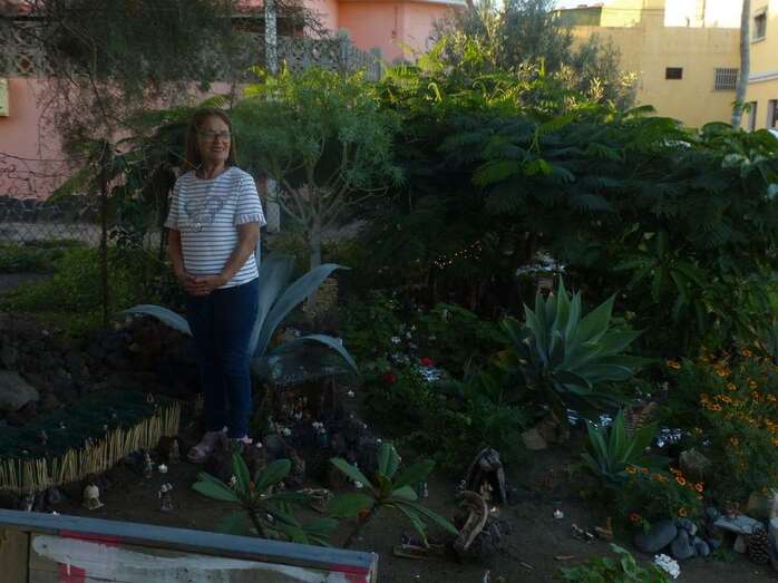 Una Navidad, hace ya nueve años, a esta vecina de Telde se le ocurrió el trasladar la típica escena navideña y montarla bajo un árbol cerca de su casa. A lo largo del año, según disponga de su tiempo, Adolfina fabrica varios de los retablos y elementos que dispondrá más adelante en el montaje.