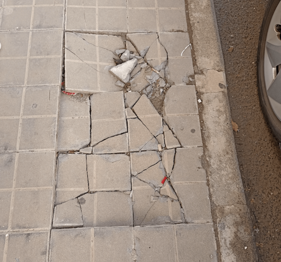 Vecinos de Las Huesas denuncian el mal estado en el que se encuentra la acera de la calle General Aranda. Advierten que varios losetas se fragmentaron hace años, pero hasta ahora nadie las ha arreglado.