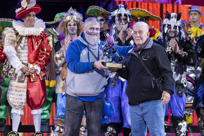 Y en lo que respecta al reparto de premios, el secreto se despejó, en torno a las 03:00 horas del domingo, seis horas después del inicio de un encuentro que comenzó con las actuaciones de Trapasones Star y Los nietos de Kika, fuera de concurso. En ese momento, Daniel Calero, rostro ineludiblemente ligado al concurso murguero grancanario, en esta ocasión acompañado por su homólogo en Tenerife, Alexis Hernández, recibió el fallo de los jurados oficiales, interpretación y vestuario, así como los conformados para designar los premios Tomás Pérez, Benito Falcón, Tito Rosales, Definitivamente yo, Paco Dávila, el Carmelo “El Pariente” y el Criticón que otorgan los medios de comunicación.