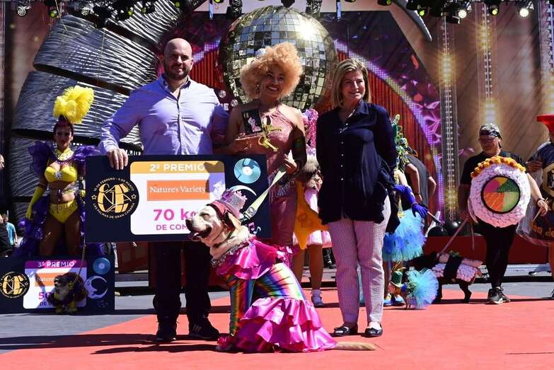 En el que será su tercer año como ganadora, la caniche gigante no estará sola en la corte canina de las carnestolendas 2023. Le acompañarán Mía, la labradora mestiza de cuatro años que se ha hecho con el segundo premio tras desfilar con Liliana Vera Casañas con la fantasía «¡Canta, canta que mi guitarra encanta!» de Alicia Ortiz y Natalia Santos. En tercer puesto ha quedado Teddy, un mestizo de tres años que ha participado junto a Ana María Alonso Morán, con el diseño titulado «Traemos ritmo al Carnaval» de Vicente Macías Vega. A ellos, Nature's Variety les ha obsequiado con 70 y 50 kilos de comida, respectivamente.