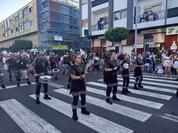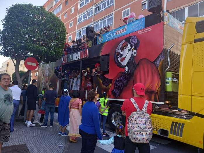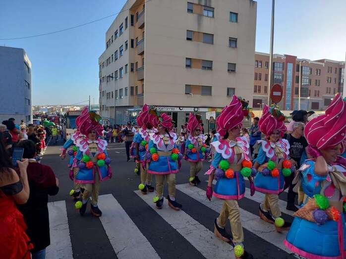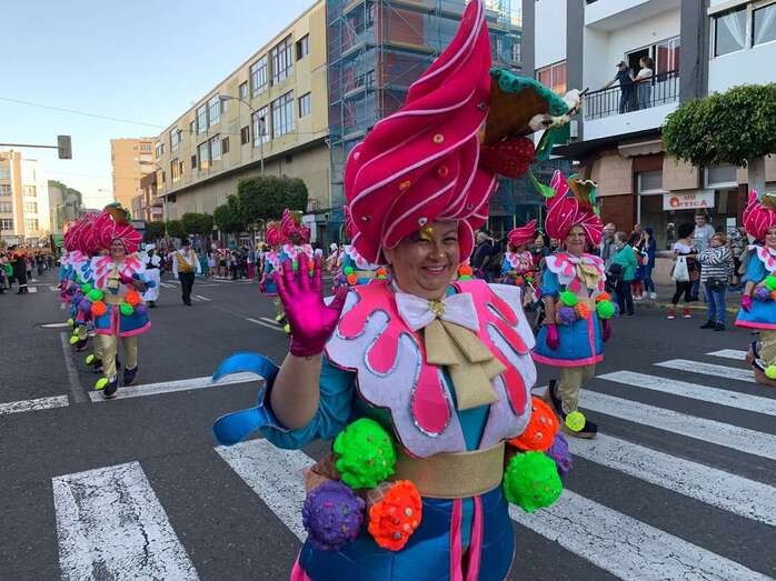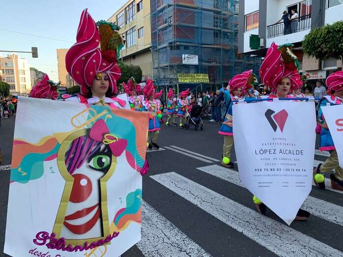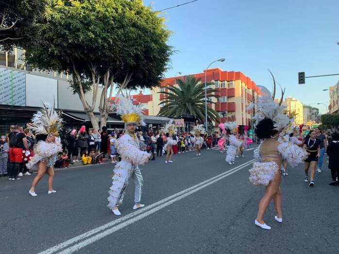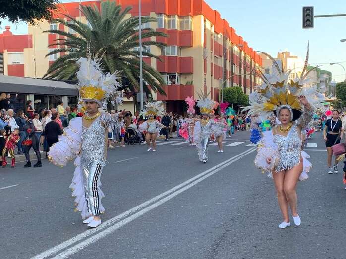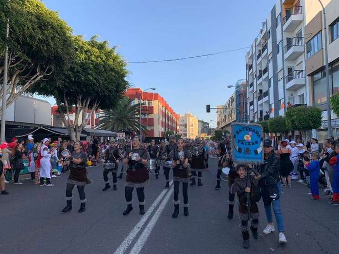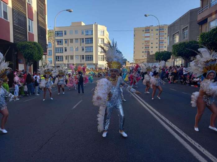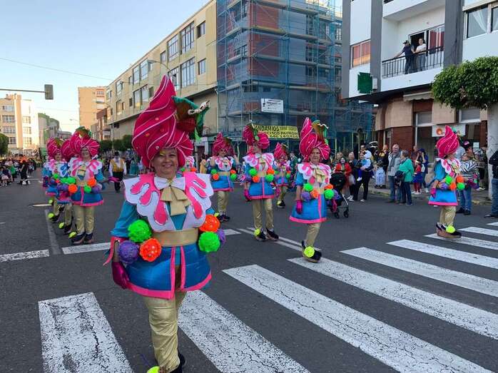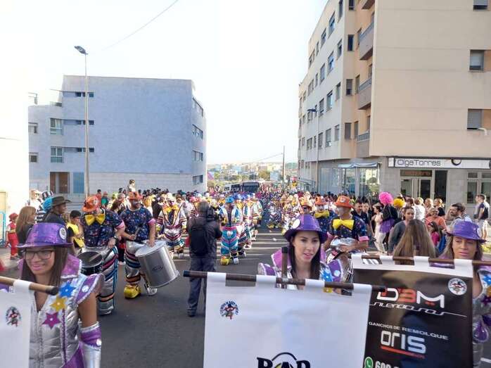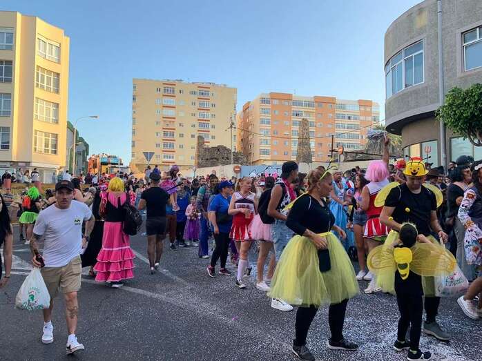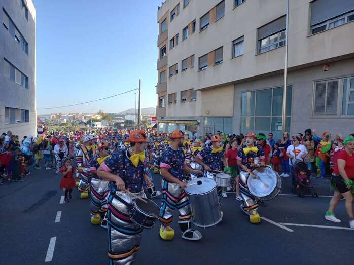 El coso carnavalero se puso en marcha a partir de las 17.30 horas en las Ramblas de Pedro Lezcano con la participación de 20 carrozas y coches engalanados, la batucada Paixao, la comparsa Nuevo Estilo y las murgas teldenses Las Golisnionas, Los Nietos de SaryMánchez y Los Diver, marcaban el ritmo al que iban bailando las mascaritas.