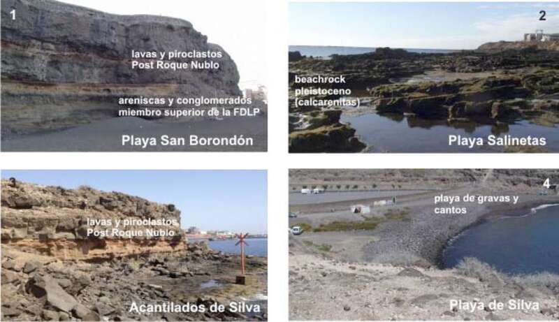Una de las sorpresas del estudio es el descubrimiento de los llamadas “beachrock” (playas fosilizadas) en Aguadulce y en Salinetas. Algunas de estas muestras se han mandado a la Universidad de Salamanca para hacer láminas delgadas con el objeto de caracterizar en la ULPGC los granos de arena al microscopio geológico y estas láminas también se van a estudiar en la Universidad de Barcelona para realizar análisis mineralógicos y químicos con el microscopio (SEM) y microsonda electrónica (EMPA) en las muestras de beachrock.