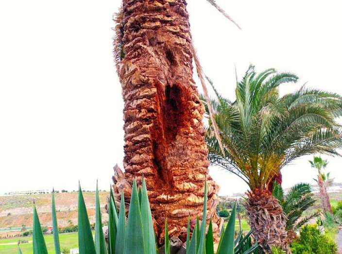 Monzón señaló que durante las tareas de poda y mantenimiento se ha constatado la presencia de oquedades en el estípite de una palmera como consecuencia, probablemente, de la presencia de Thielaviopsis Paradoxa. Este hongo, precisa el edil, es la causa de la podredumbre de partes de la palmera que puede provocar incluso un crecimiento lateral del meristemo y una curva en el estípite de la planta, lo que pone en riesgo su verticalidad.
