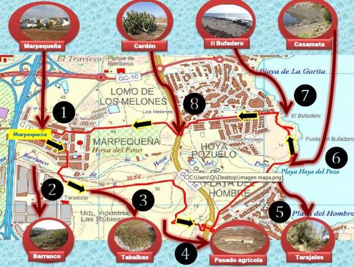 La ruta de senderismo, de unos 5 km de longitud, comenzó en el centro del barrio, descendiendo primeramente al barranco de Hoya del Pozo. Tomaron la dirección de las llanuras agrícolas de Las Rubiesas para cruzar el vial costero y desciende a la playa de Hoya del Pozo para hacer un descanso a la sombra de los tarajales.