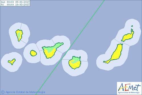 El aviso amarillo activado por la Aemet afecta a Fuerteventura, Lanzartote, El Hierro y La Gomera enteras, el sur de Tenerife y Gran Canaria y toda La Palma, salvo la cumbre.