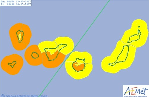 Para el resto del archipiélago mantiene el aviso amarillo por los mismo fenómenos meteorológicos.