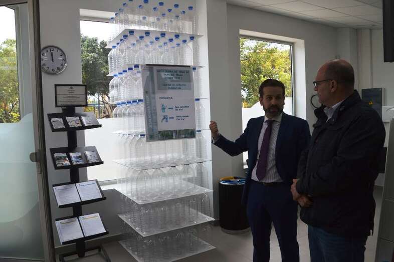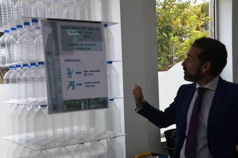 Una de las curiosidades presentadas este jueves ha sido la pila de 200 garrafas de cinco litros que equivalen a un metro cúbico de agua con la comparativa de precios (160 euros si está embotellada frente a 1,74 euros si es del servicio abonado). La media de consumo en los hogares teldenses es de 15 metros cúbicos cada dos meses.