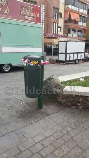 Según testimonian vecinos del lugar, los contenedores y las papeleras rebosan de basura al no funcionar la madrugada de los domingos los servicios de recogida de basura. El equipo de mantenimiento no intervendrá hasta el mediodía.