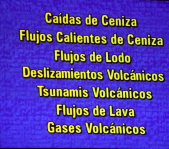 Preguntas como ¿A que afectan directa y principalmente las coladas de lava? ¿Qué es un flujo caliente de cenizas o flujo piroclástico? ¿Qué peligro volcánico se mueve a mayor velocidad? ¿Cuáles son las zonas más peligrosas en caso de que se produzca un lahar o flujo de lodo? ¿Cuáles pueden ser las causas de un Tsunami volcánico? ¿Cuándo se manifiesta el peligro asociado a la emisión de gases volcánicos? ¿En qué famoso volcán se grabó por primera vez en directo un deslizamiento gravitacional? ¿Cuándo se manifiesta el peligro asociado a los terremotos volcánicos? A quiénes genera daños la deformación del terreno, etc.